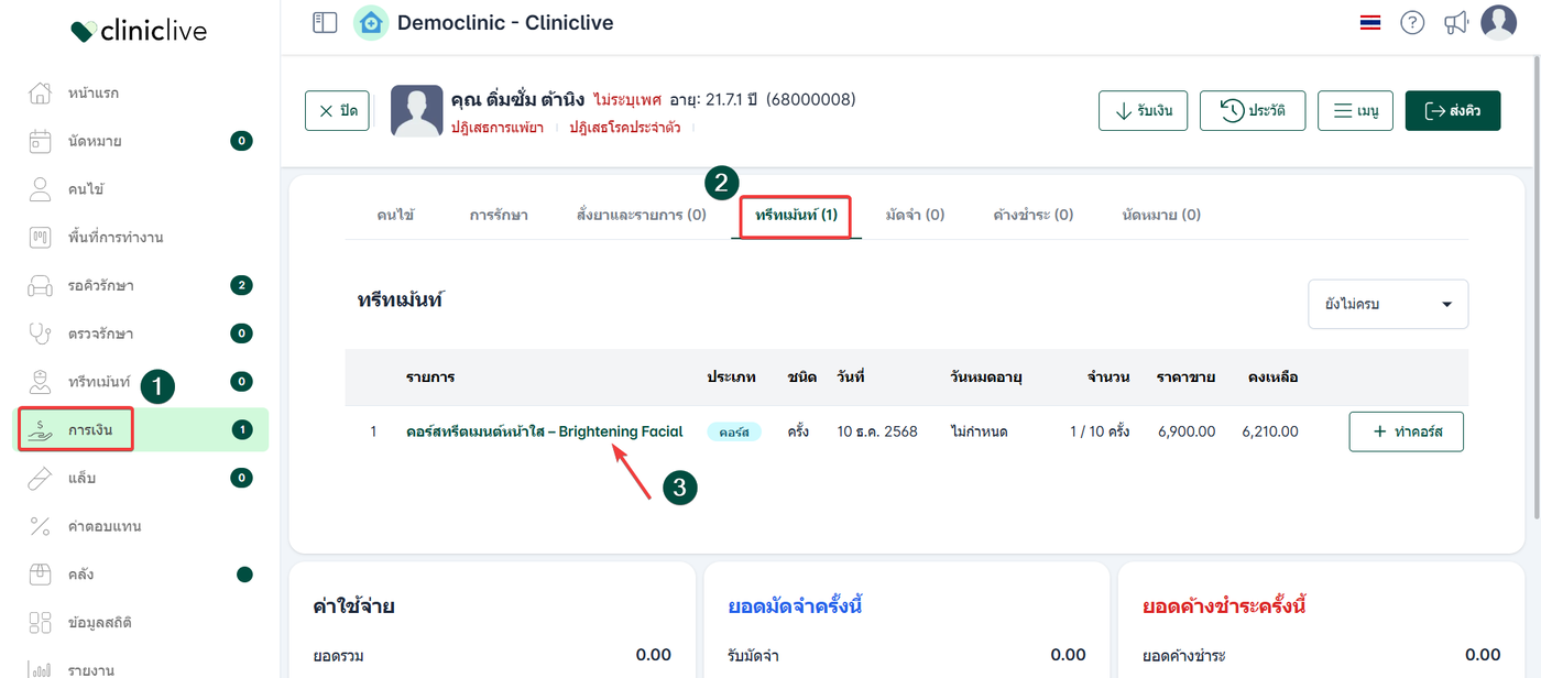 หากคอร์สทรีทเม้นท์ที่ต้องการคืนมี ยอดค้างชำระ ผู้ใช้งานสามารถดำเนินการตามขั้นตอนดังนี้