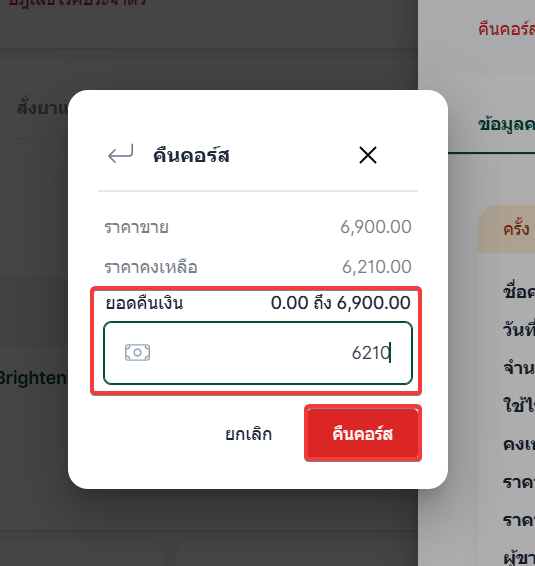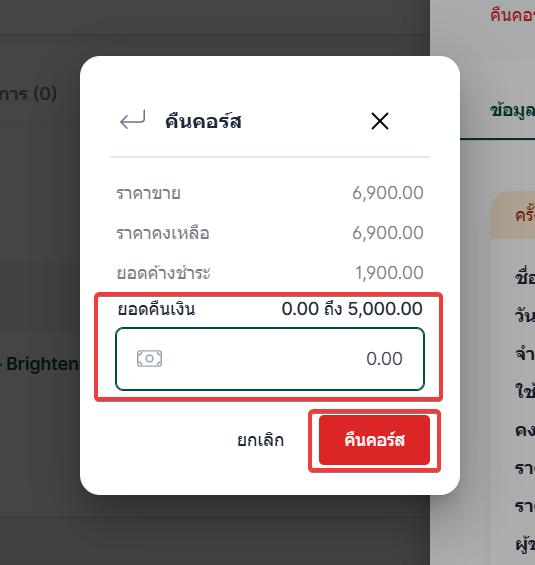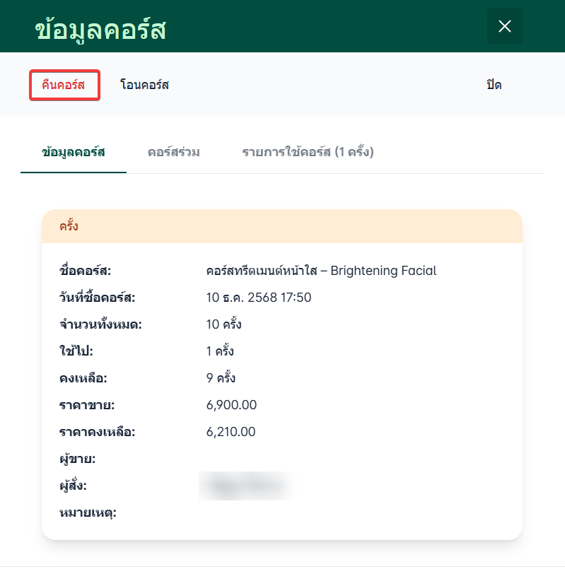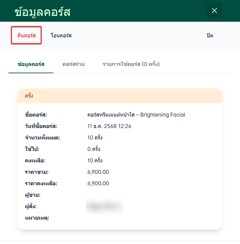 เมื่อระบุยอดเงินที่จะคืนเรียบร้อยแล้ว ให้กดปุ่ม “คืนคอร์ส” ระบบจะบันทึกการคืนคอร์สและอัปเดตสถานะของคอร์สและยอดเงิน