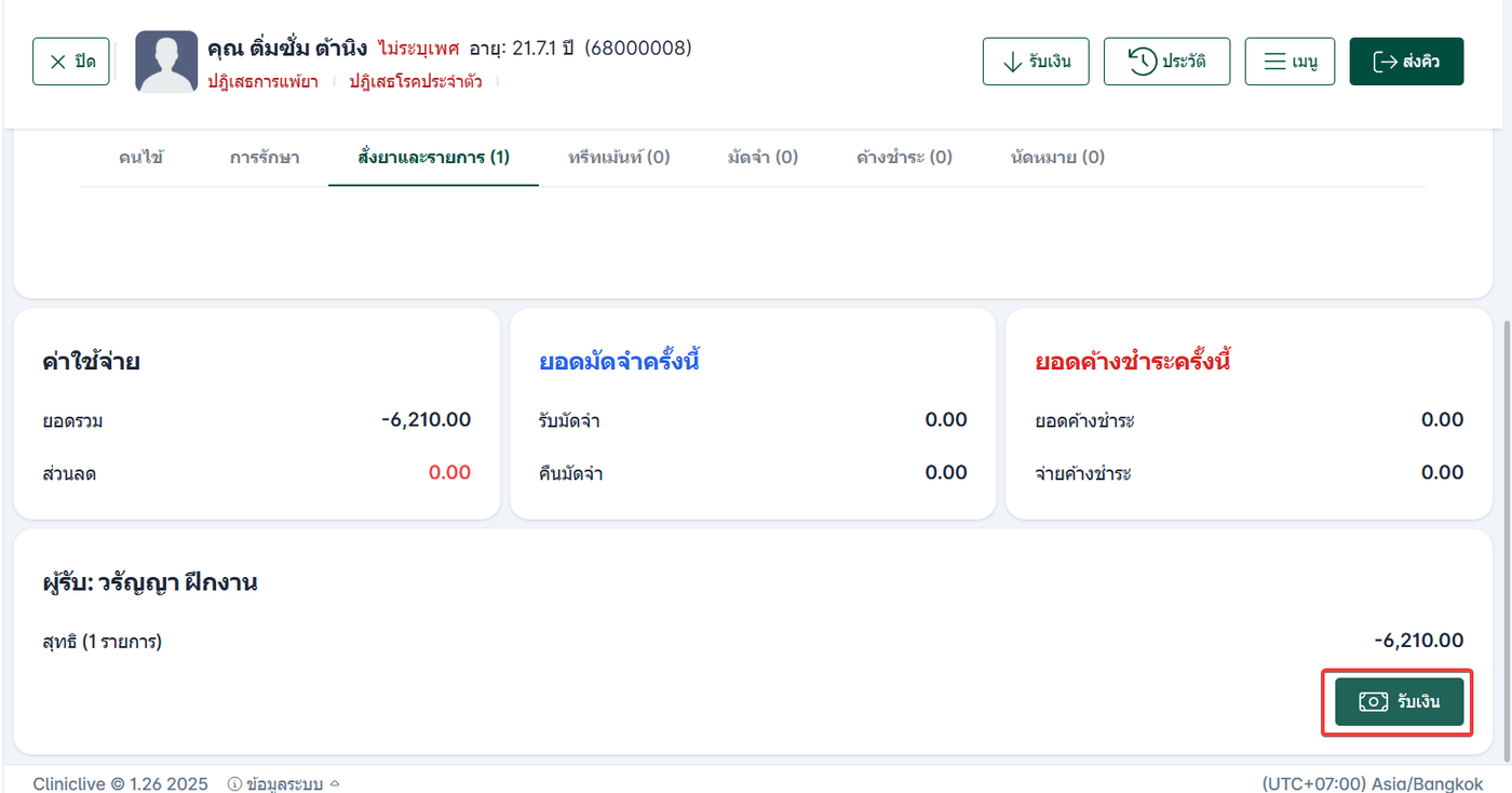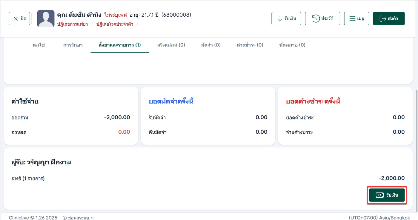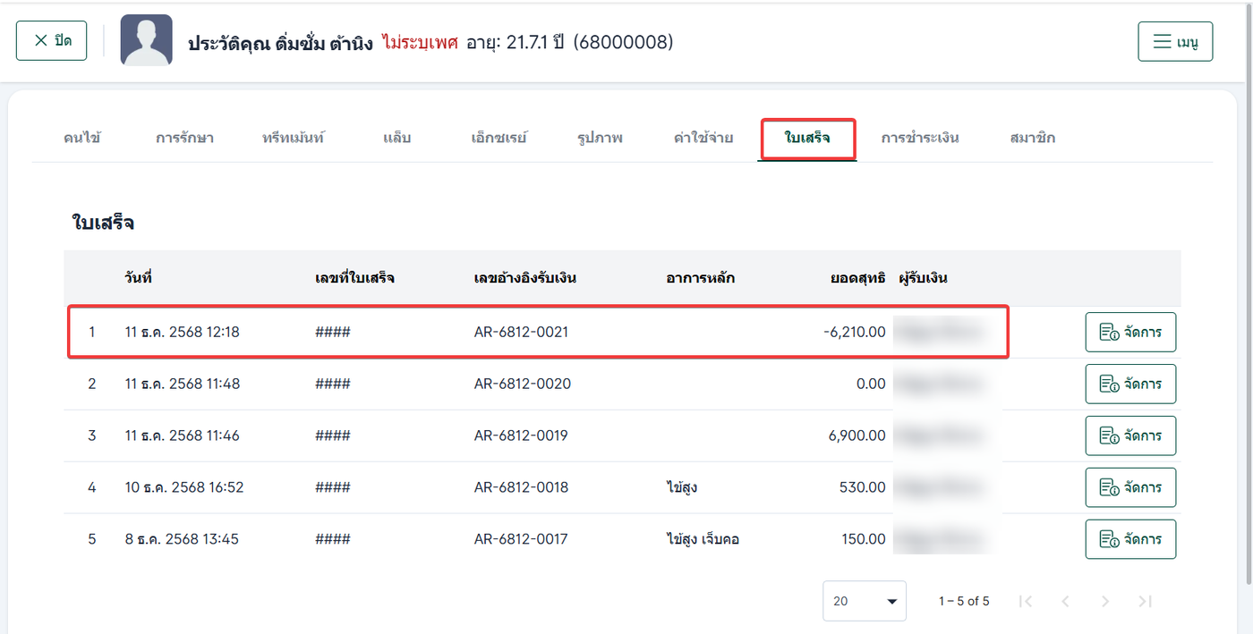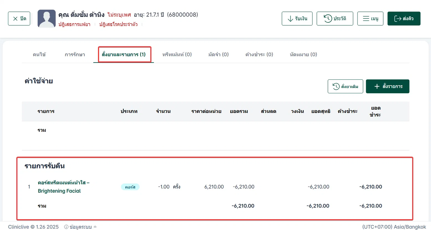 ผู้ใช้งานสามารถเข้าไปตรวจสอบ ใบเสร็จ ที่เกี่ยวข้องกับการคืนคอร์สหรือรายการอื่นๆ ได้ที่เมนู ประวัติคนไข้ โดยระบบจะแสดงรายการใบเสร็จทั้งหมดที่เกี่ยวข้องกับผู้รับบริการรายนั้น เพื่อให้สามารถตรวจสอบรายละเอียดได้
