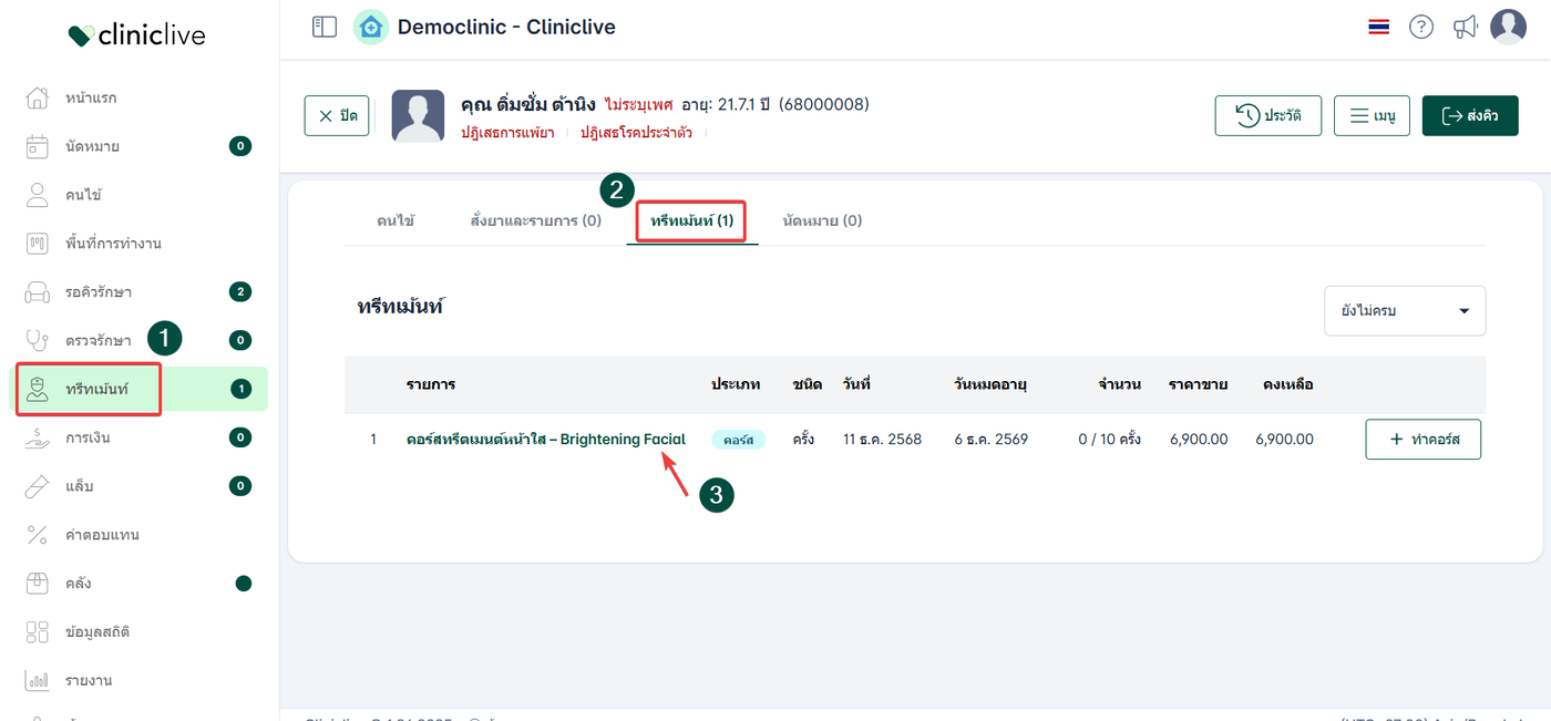 ระบบจะแสดงรายการคอร์สทรีทเม้นท์ที่มีอยู่คลิกที่ ชื่อคอร์สทรีทเม้นท์ ที่ต้องการทำการคืน