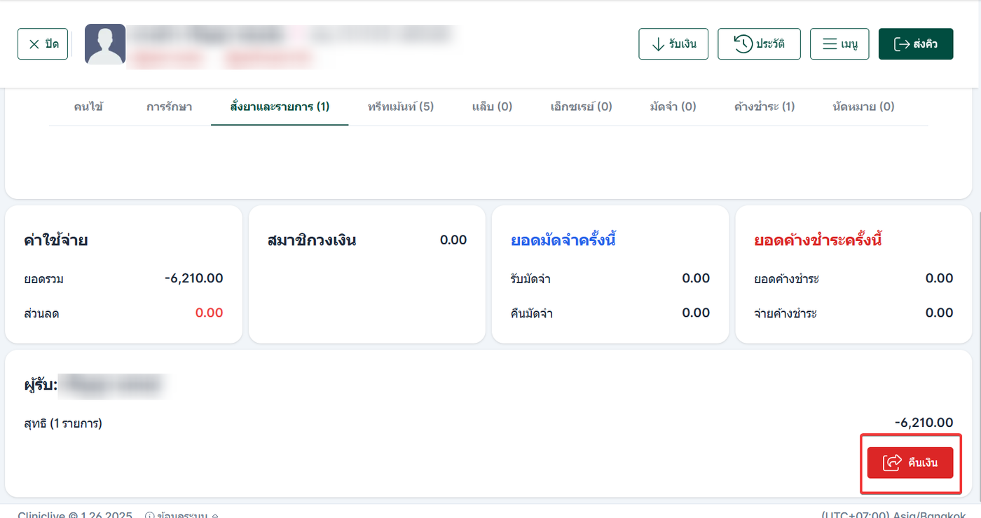 จากนั้น ผู้ใช้งานสามารถกดปุ่ม “คืนเงิน” เพื่อดำเนินการคืนยอดเงินให้ผู้รับบริการตามจำนวนที่ได้ระบุไว้ก่อนหน้า