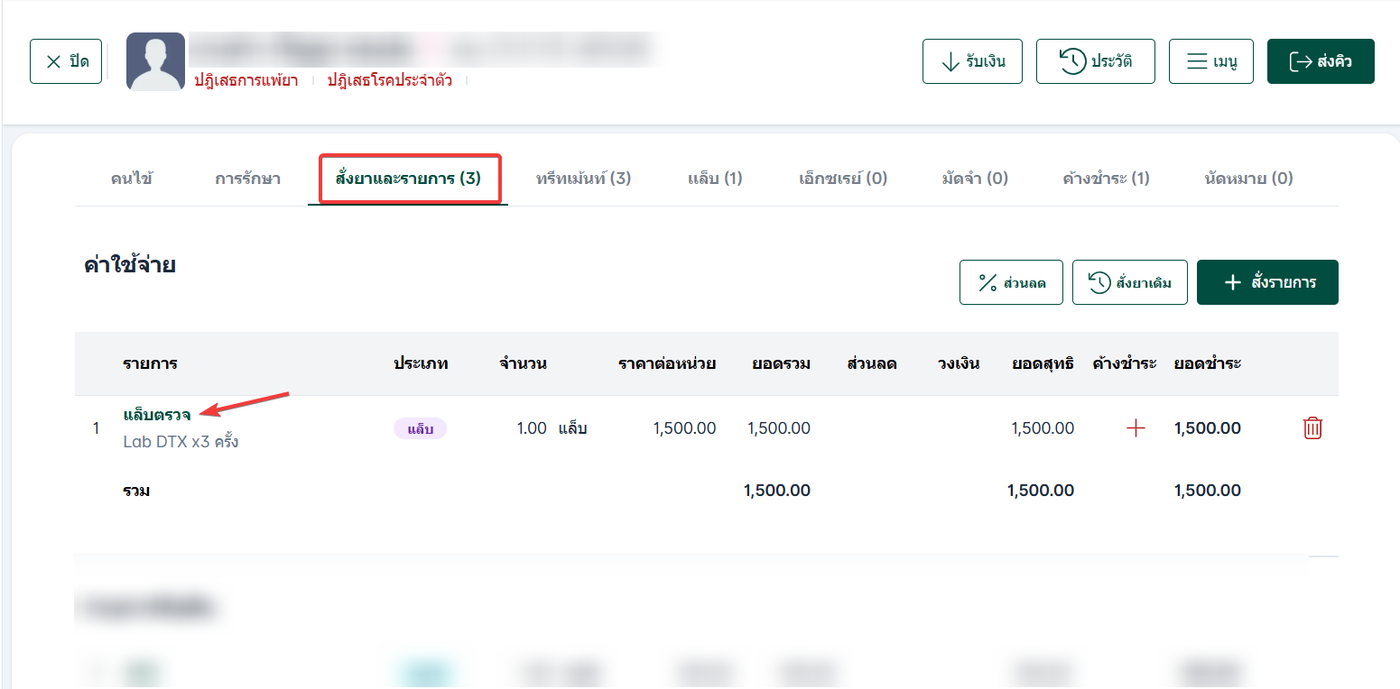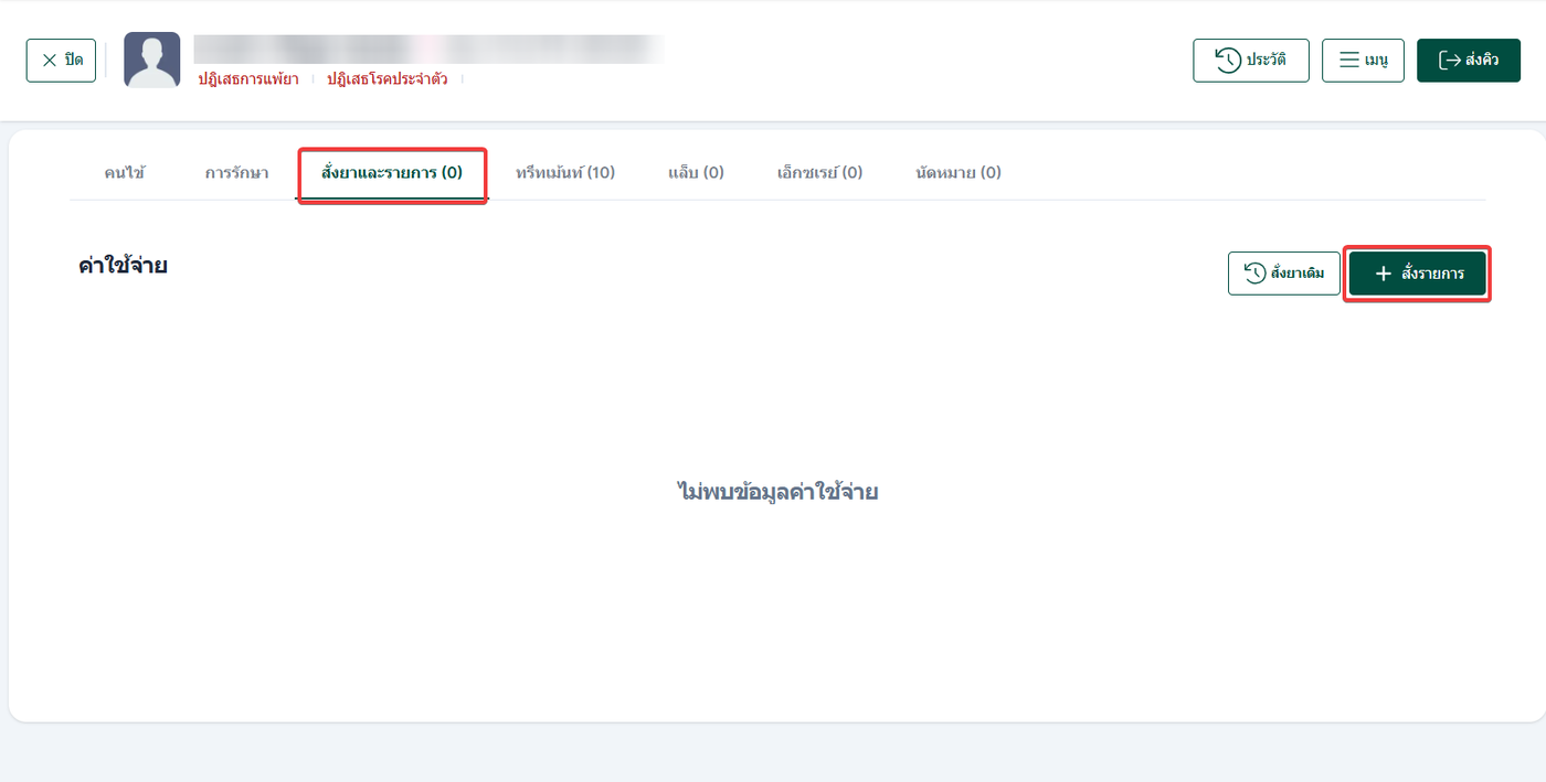 ผู้ใช้งานสามารถสั่งตรวจแล็บได้โดยไปที่แท็บ สั่งยาและรายการ