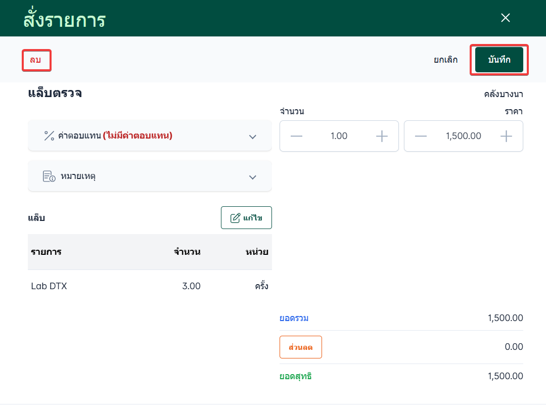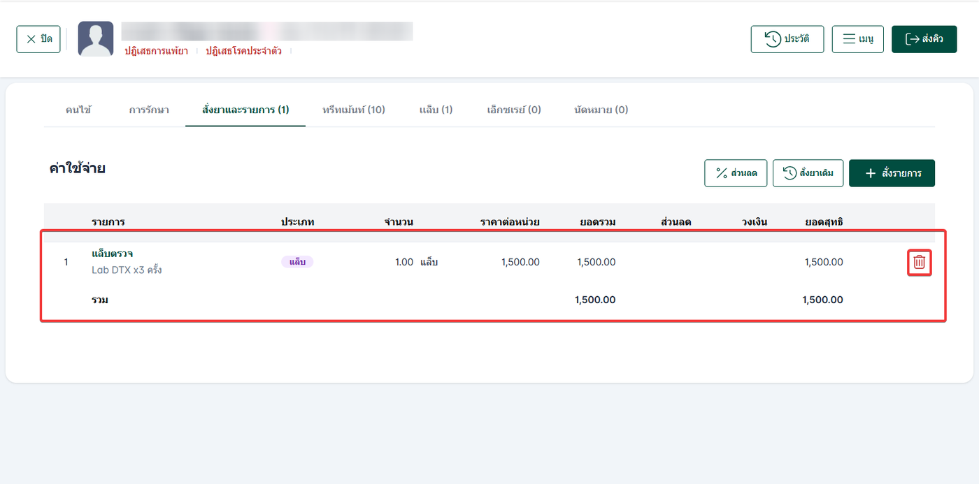 ผู้ใช้งานสามารถ ลบรายการที่สั่ง ได้ หากยังไม่ได้ส่งตรวจ