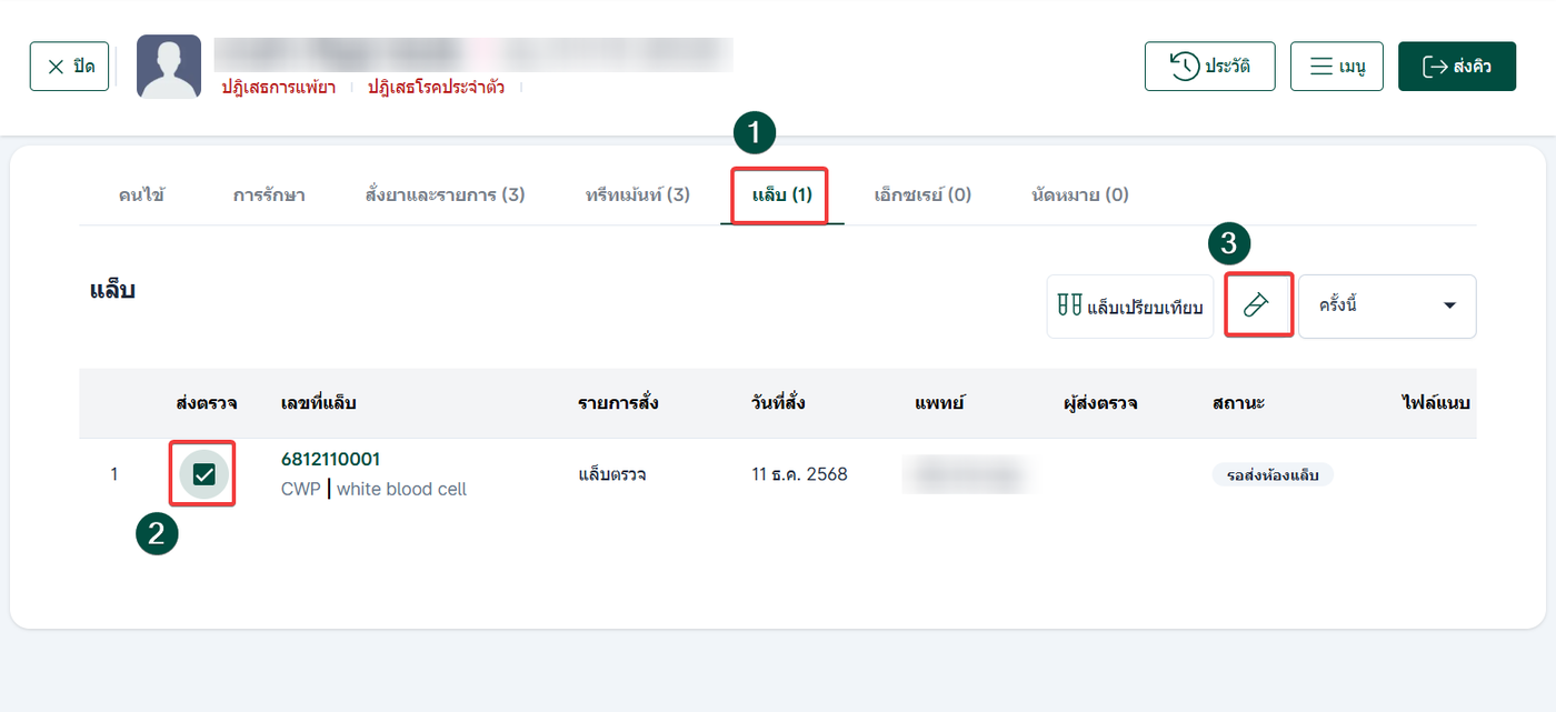คลิกที่ ไอคอนแล็บ เพื่อทำการส่งตรวจ