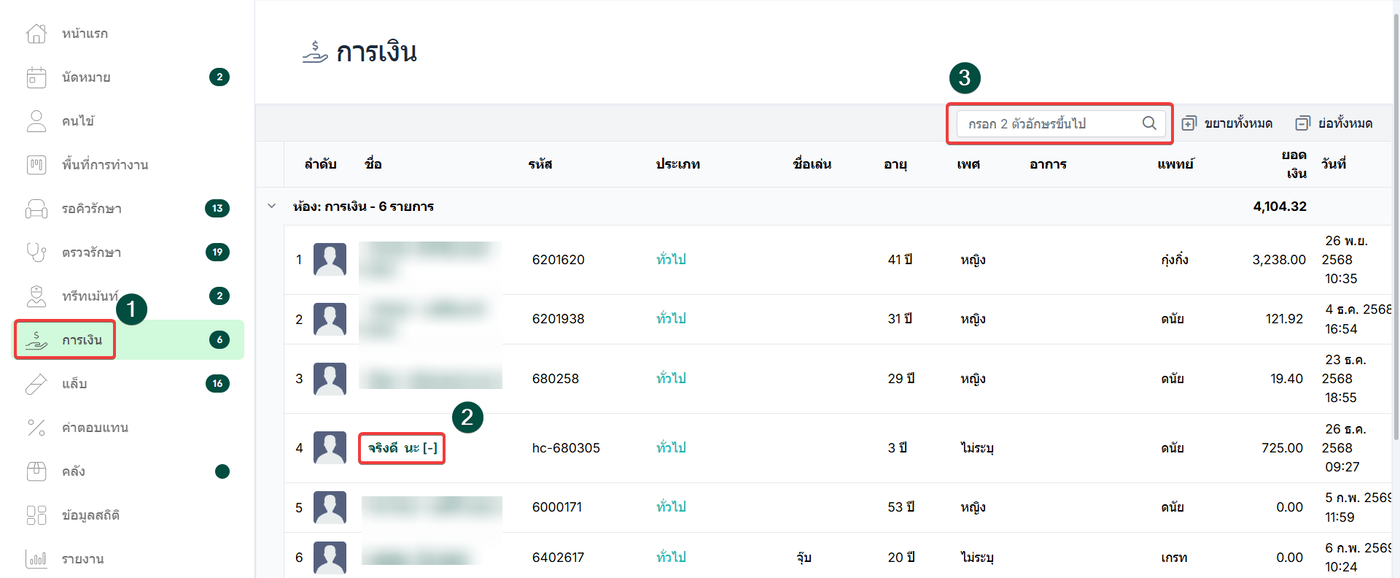 เมื่อผู้ใช้งานคลิกเข้ามาที่ห้องการเงิน ระบบจะแสดงชื่อคนไข้ที่ถูกส่งคิวมาที่ห้องการเงิน