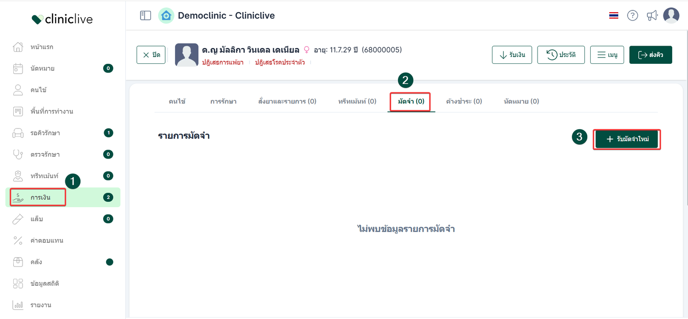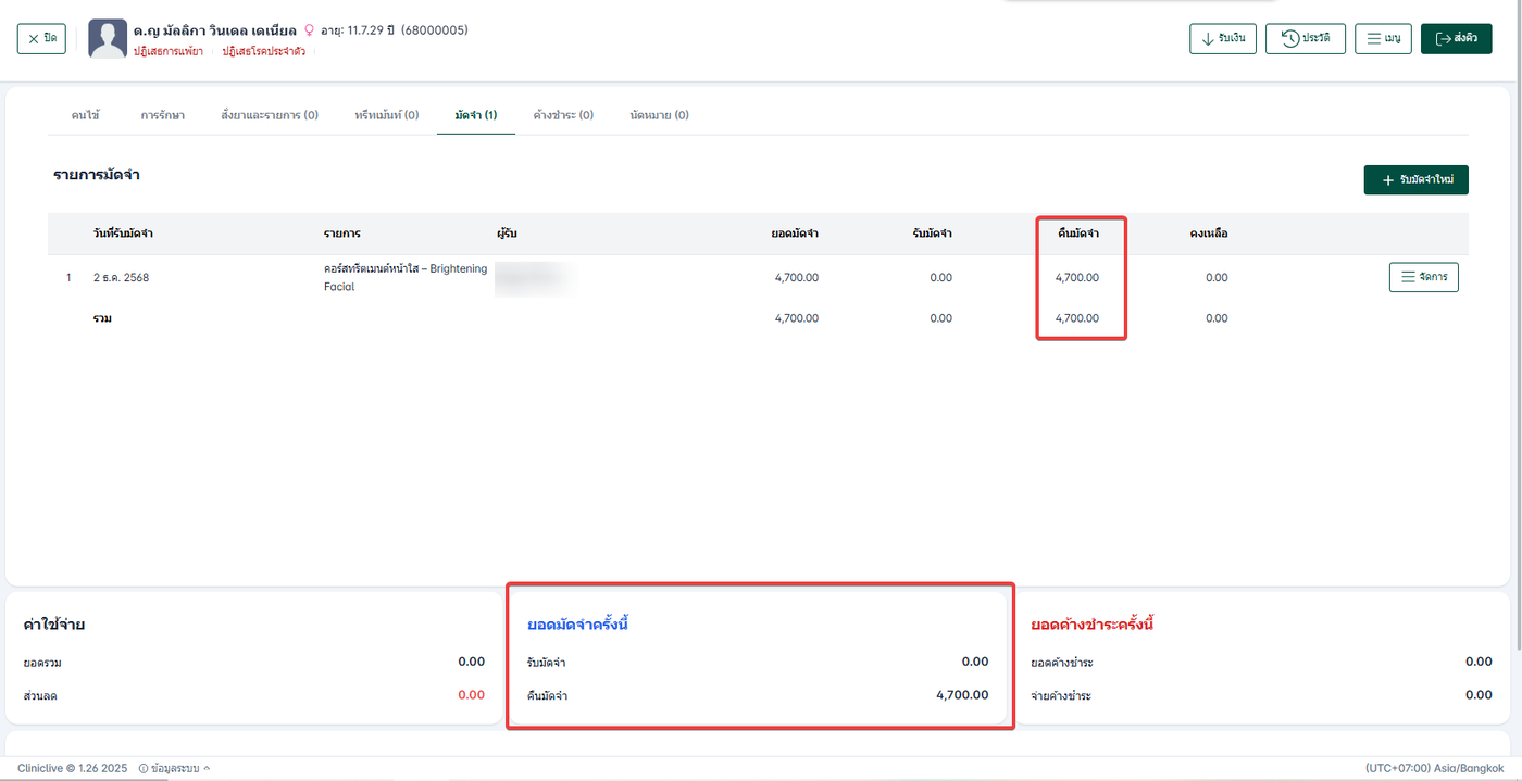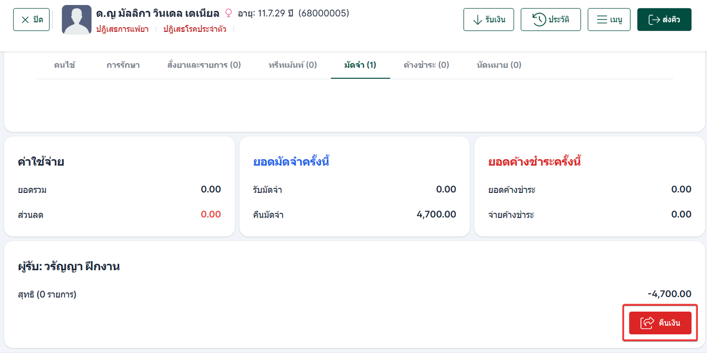 จะสามารถคืนได้เมื่อคนไข้จบการชำระเงินรอบนี้และมาทำการในห้องการเงินรอบใหม่ เมื่อคนไข้เข้ามาทำการอีกครั้ง ในเมนูการเงิน หัวข้อมัดจำ ระบบจะแสดงรายการมัดจำและปุ่มคืนมัดจำ ผู้ใช้งานจะสามารถคลิกคืนมัดจำได้