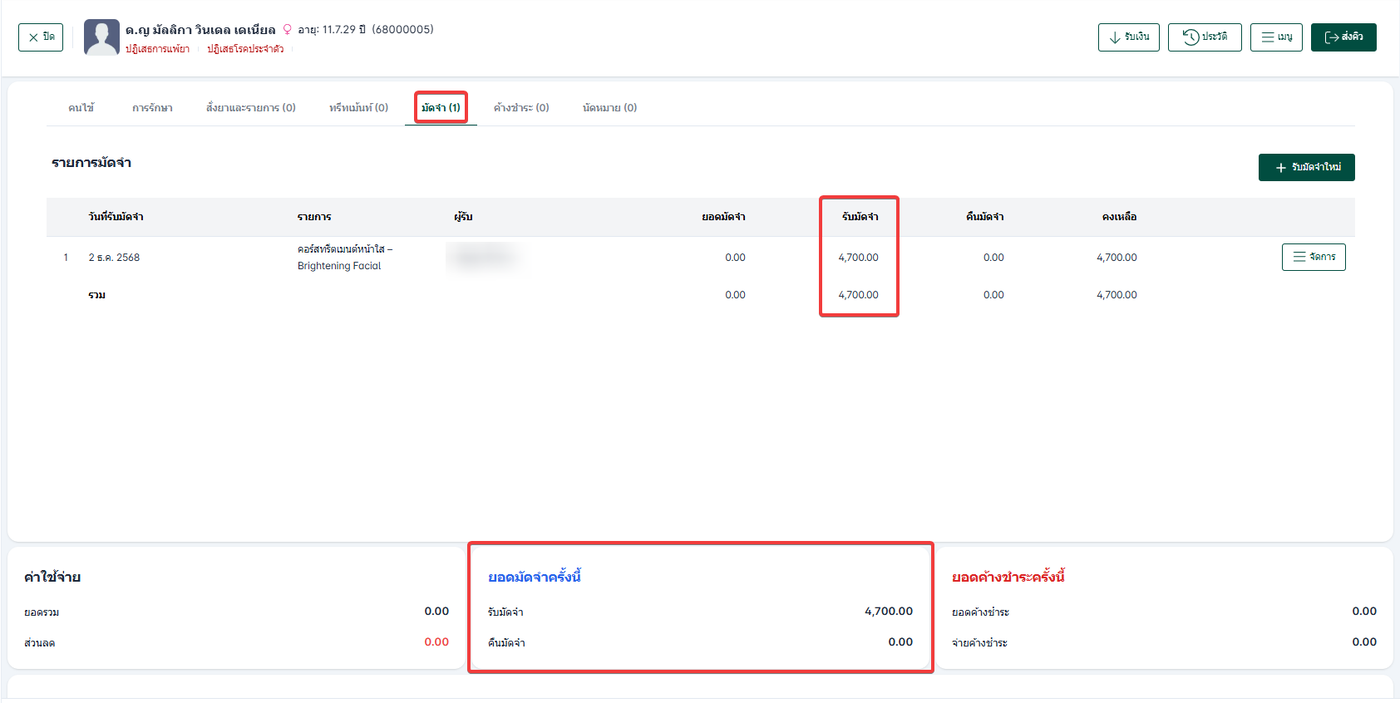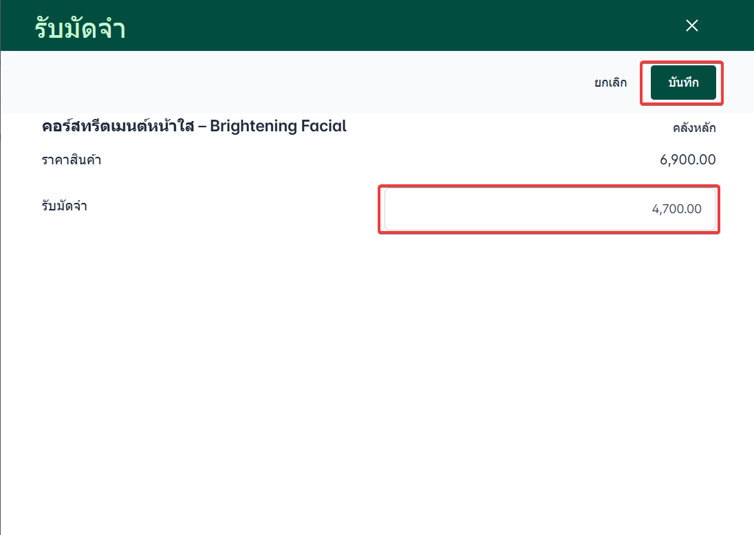 เมื่อเลือกรายการ ระบบจะแสดงหน้าต่างรับมัดจำ ให้ผู้ใช้งานระบุจำนวนที่ต้องการรับมัดจำ จากนั้นกดบันทึก