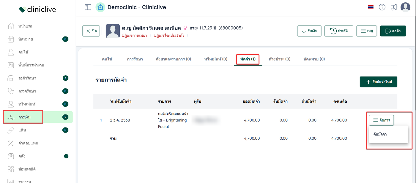 เข้าไปที่หน้าการเงิน ไปที่แท็บมัดจำ และกดจัดการ ระบบจะแสดงปุ่มให้คลิกคืนมัดจำ