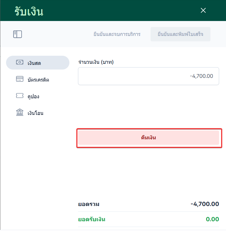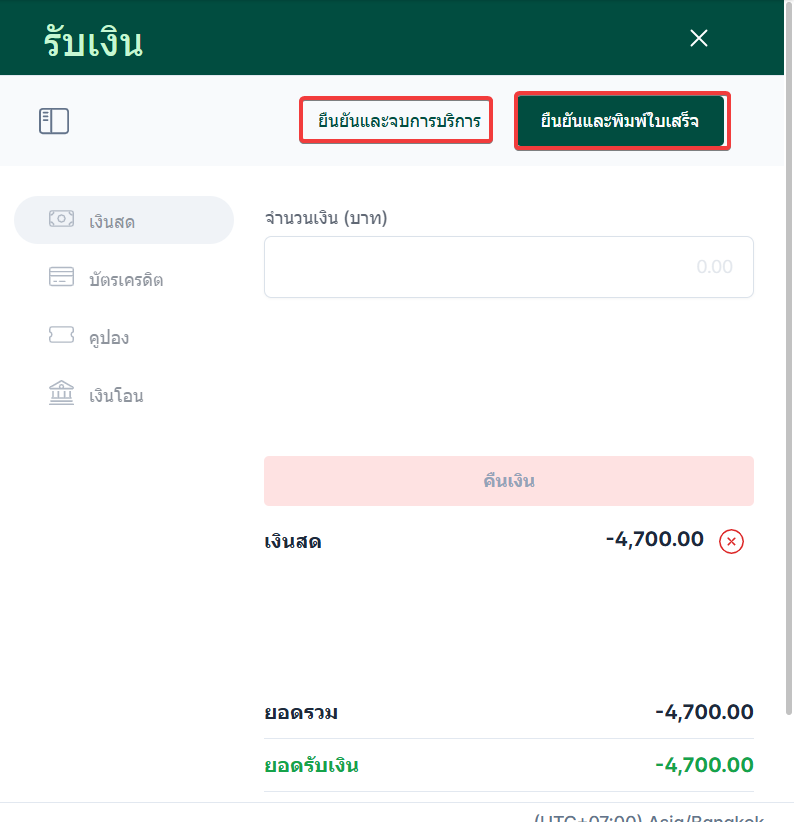 หากต้องการยืนยันและจบบริการโดยไม่ต้องการพิมพ์ใบเสร็จ ให้คลิก “ยืนยันและจบบริการ“