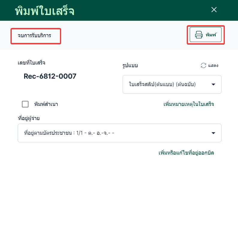 เมื่อดำเนินการตามขั้นตอนเสร็จเรียบร้อยแล้วหรือไม่ต้องการสั่งพิมพ์ใบเสร็จสามารถกด จบการรับบริการ ด้านซ้ายบนได้เลย