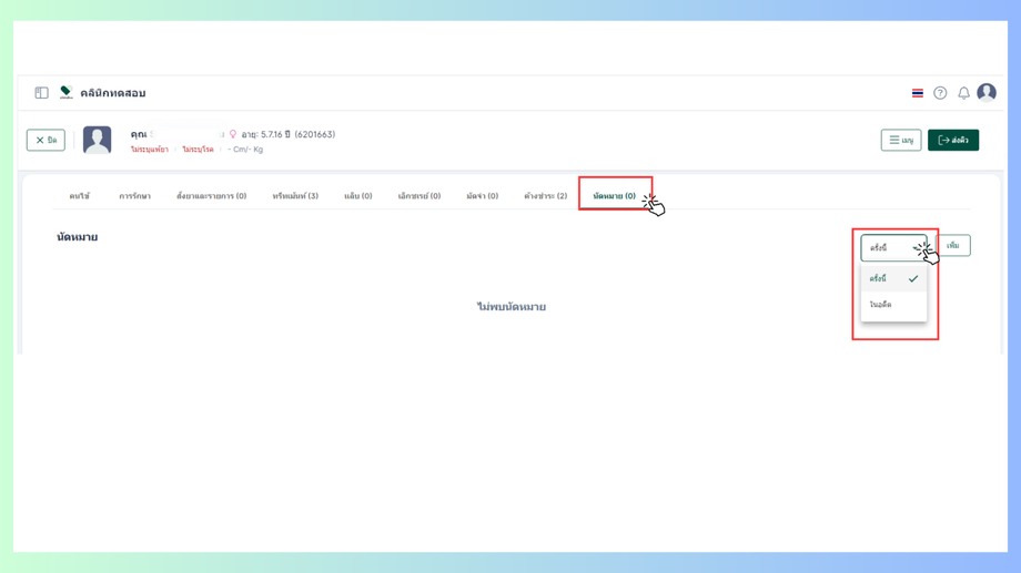 ผู้ใช้งานสามารถทำนัดหมายกับคนไข้ได้ผ่าน หัวข้อนัดหมายในห้องการเงิน ผู้ใช้งานสามารถเลือกดูรายการนัดหมายของคนไข้แบ่งเป็น