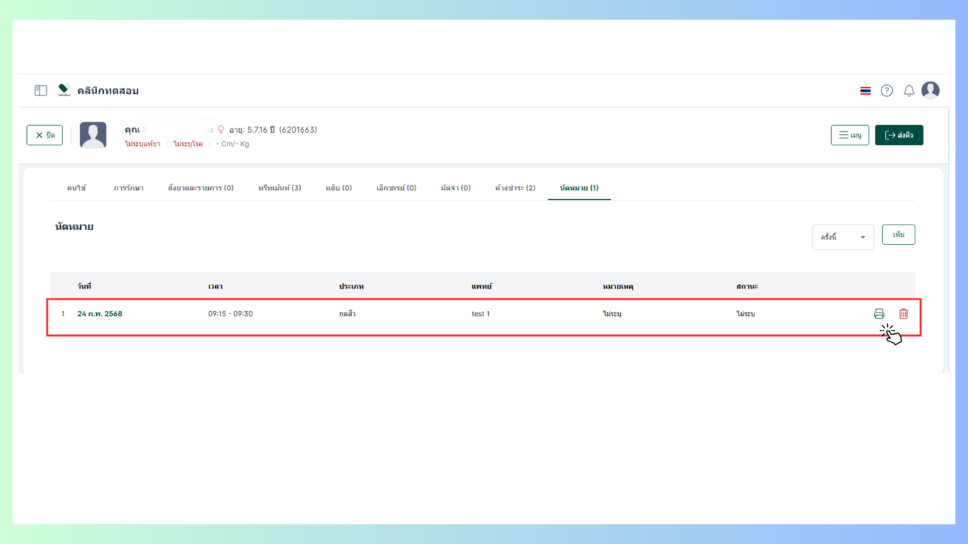 สามารถพิมพ์ใบนัดหมายได้จากไอคอนนี้