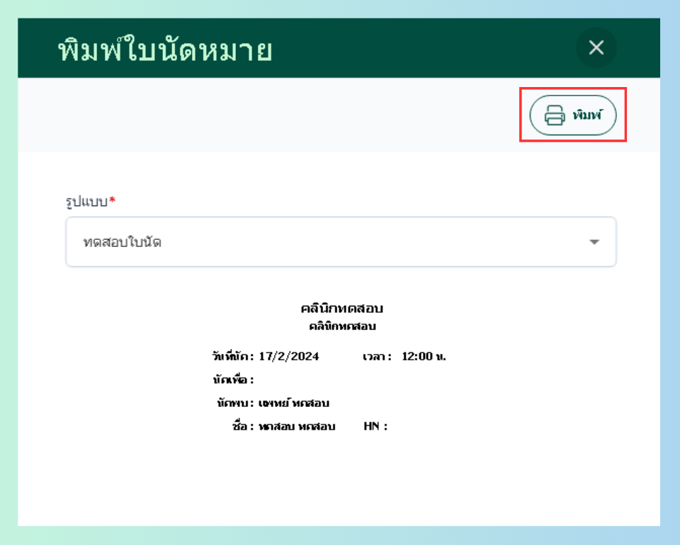 คลิกที่พิมพ์ เพื่อทำการพิมพ์ใบนัดหมาย