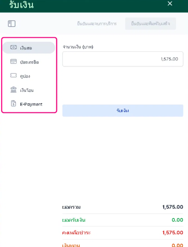 เมื่อเข้าสู่ขั้นตอนการรับชำระเงิน ระบบจะเปิด หน้ารับเงิน ซึ่งผู้ใช้งานสามารถเลือก ช่องทางการชำระเงิน ได้ตามความต้องการของผู้ป่วย เช่น เงินสด บัตรเครดิต คูปอง เงินโอนหรือE-Payment
