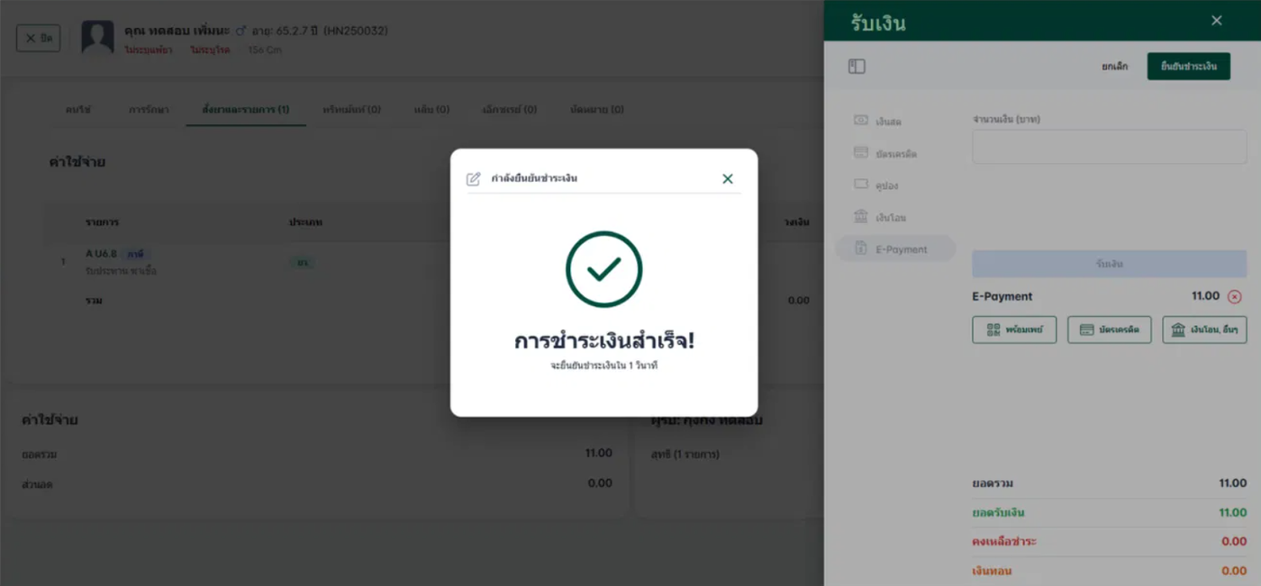 ในกรณีที่ผู้ป่วยชำระเงินด้วย เงินสด ผู้ใช้งาน ระบุจำนวนเงินสดที่ลูกค้าชำระ ลงในช่องที่กำหนด ระบบจะนำยอดเงินที่ระบุไปคำนวณกับยอดที่ต้องชำระ และแสดงผลเงินทอนให้อัตโนมัติ (หากมี)