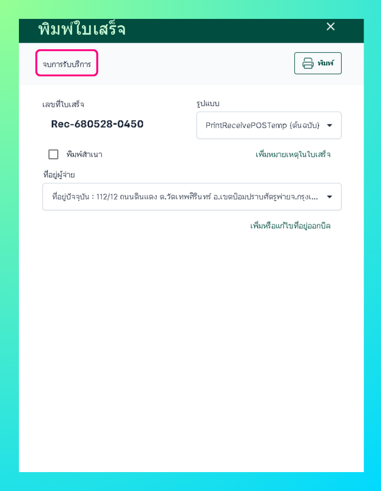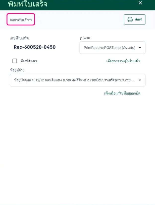 เมื่อดำเนินการตามขั้นตอนเสร็จเรียบร้อยแล้วหรือไม่ต้องการสั่งพิมพ์ใบเสร็จสามารถกดจบบริการด้านขวาบนได้เลย