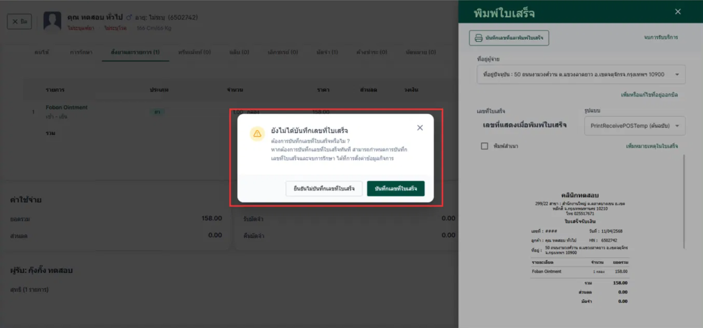 เมื่อมีการจบการรับบริการโดยไม่ได้มีการพิมพ์ใบเสร็จ ระบบจะแจ้งเตือน เพื่อการยืนยันว่าการจบการรับบริการจะบันทึกเลขที่ใบเสร็จหรือไม่