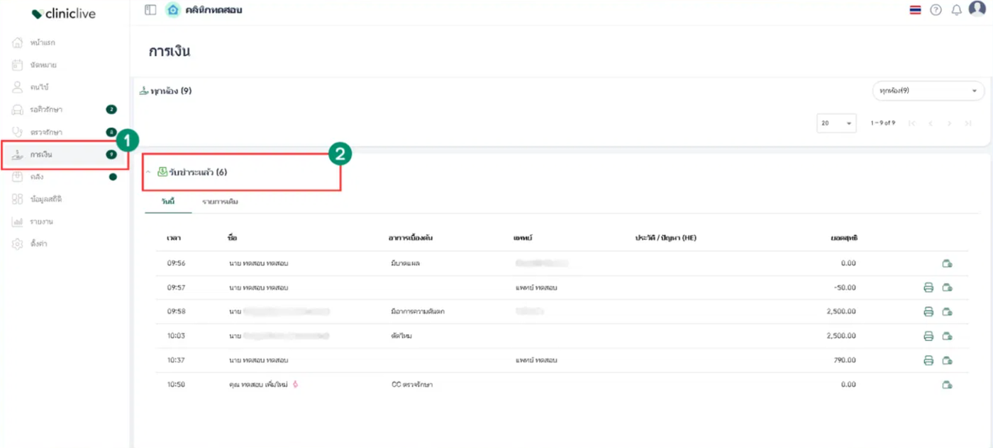 ระบบจะแสดงรายการชำระเงินในวันนี้ จะแสดง เวลา ชื่อคนไข้ อาการเบื้องต้น แพทย์ ประวัติ/ปัญหา และยอดสุทธิ