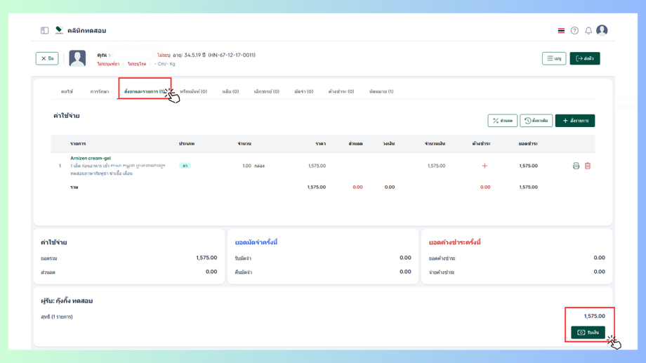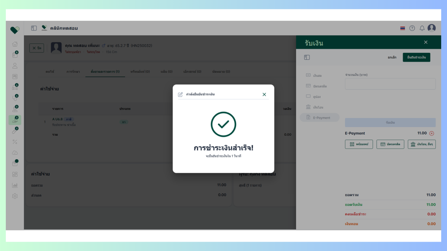 - เมื่อคนไข้ชำระเงินกดเลือกชำระเงินตามที่คนไข้ต้องการ ระบบจะแสดงยอดการรับเงินหากลูกค้าจ่ายเงินสดเกิน ระบบจะแสดงเงินทอนในช่องเงินทอน