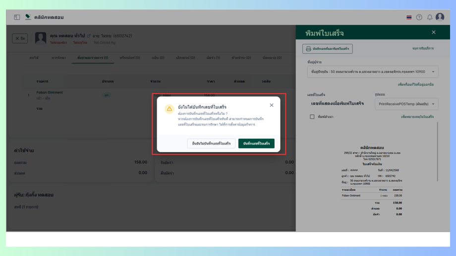 เมื่อมีการจบการรักษาโดยไม่ได้มีการพิมพ์ใบเสร็จ ระบบจะแจ้งเตือน เพื่อการยืนยันว่าการจบการรักษาจะบันทึกเลขที่ใบเสร็จหรือไม่