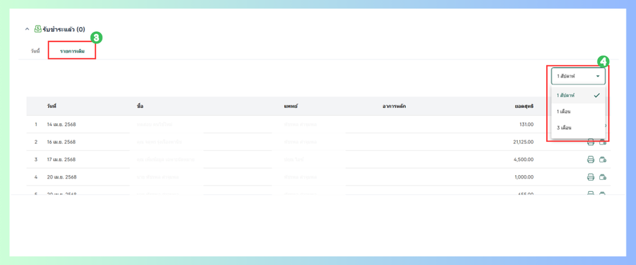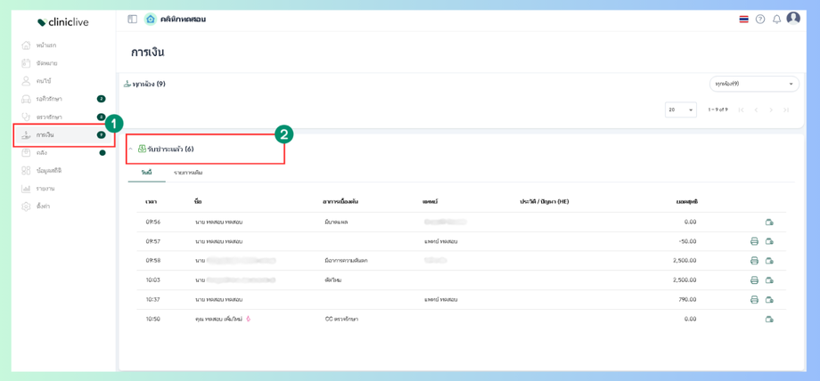 - ระบบจะแสดงรายการชำระเงินในวันนี้ จะแสดง เวลา ชื่อคนไข้ อาการเบื้องต้น แพทย์ ประวัติ/ปัญหา และยอดสุทธิ