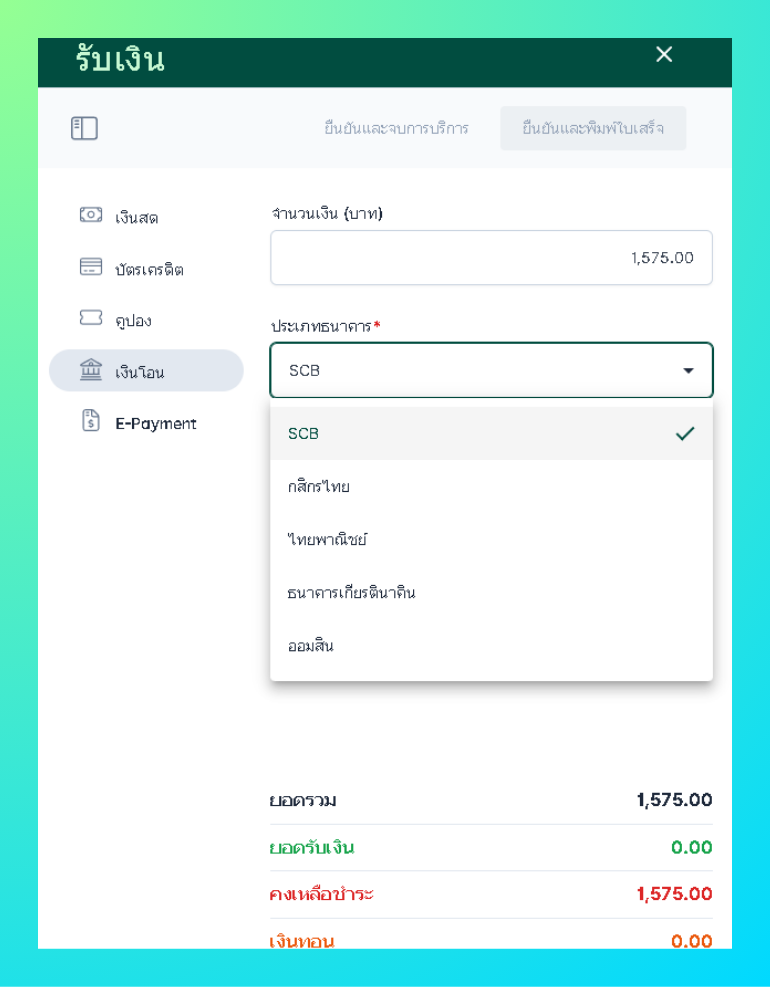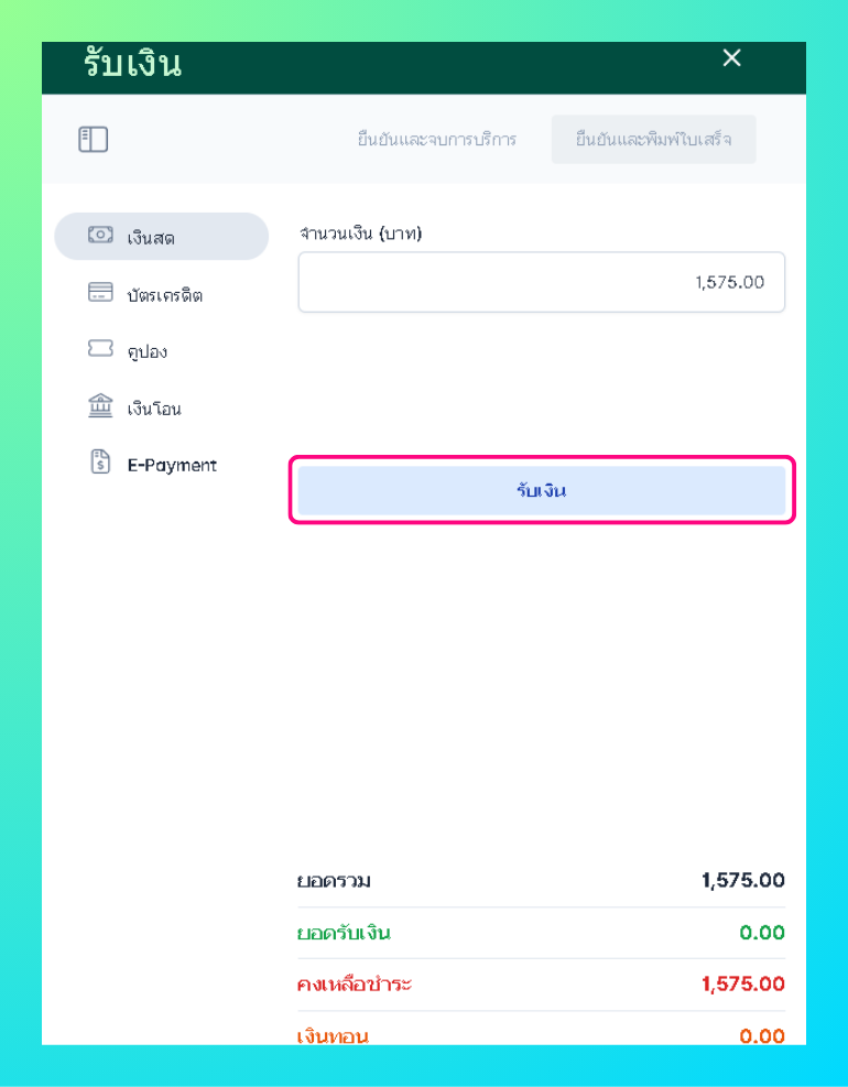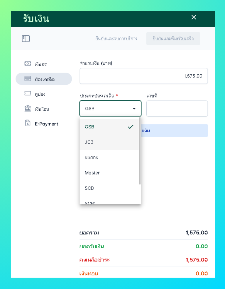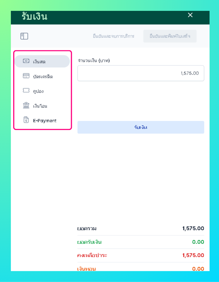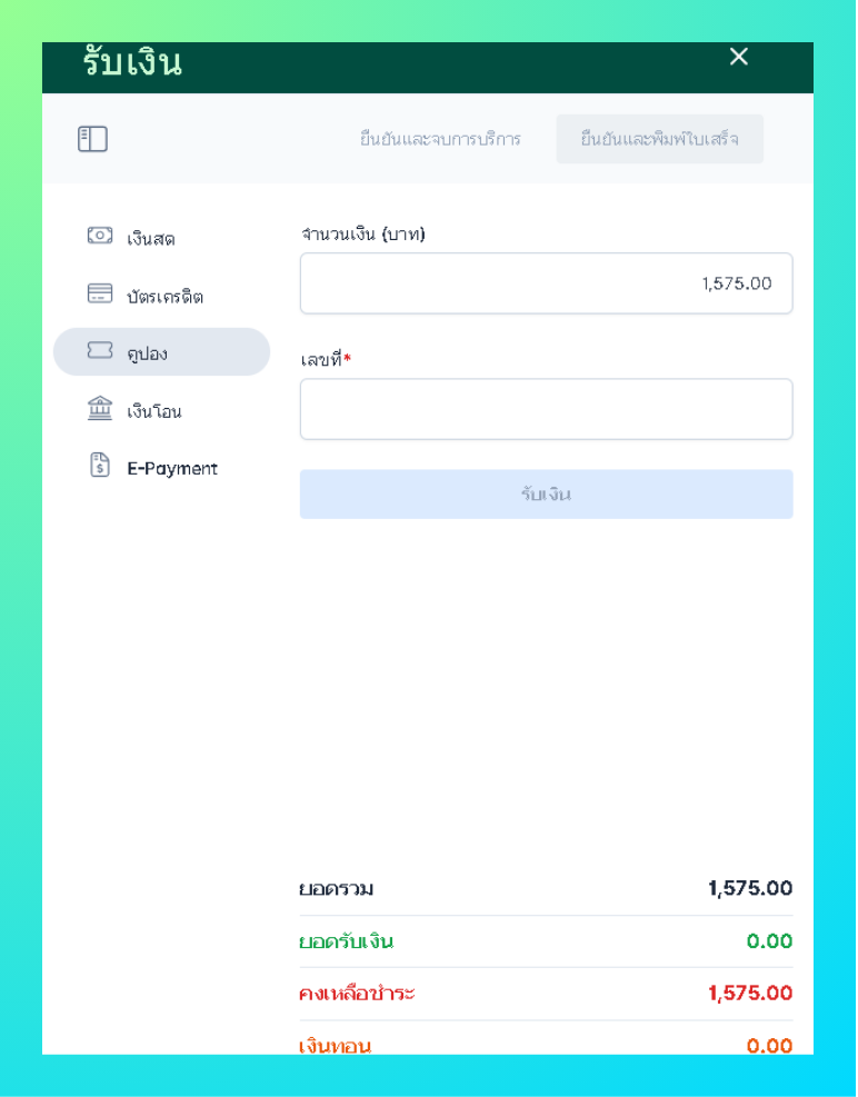ในส่วนของการรับเงิน ระบบสามารถรับเงินได้ทั้ง เงินสด บัตรเครดิต คูปอง และ เงินโอน