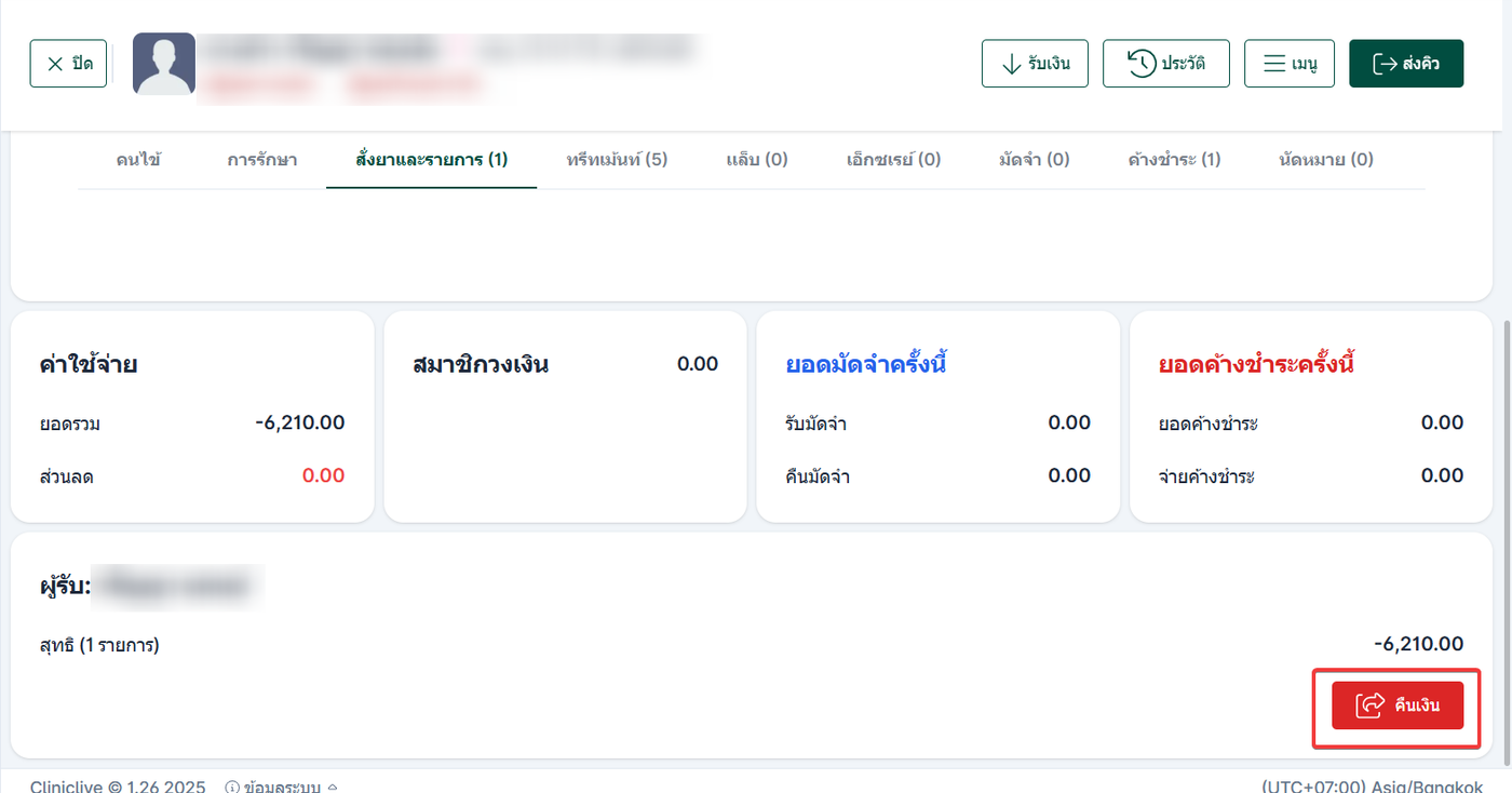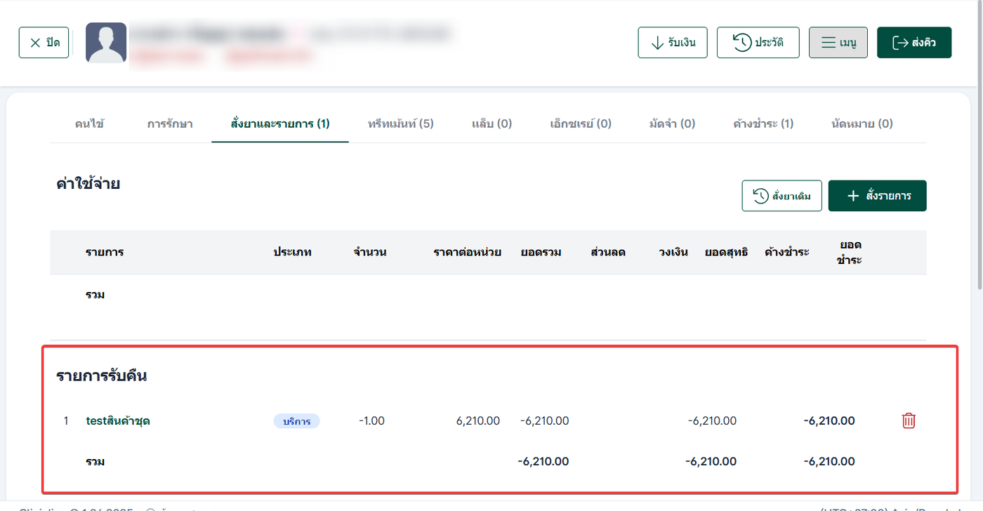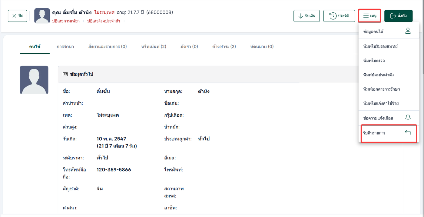 เมื่อผู้ใช้งานเลือกคนไข้ที่ต้องการรับคืนสินค้า ระบบจะเข้าสู่ หน้าข้อมูลคนไข้ จากนั้นให้คลิกที่ ไอคอน 3 ขีด เพื่อเปิดเมนู และเลือกคำสั่ง รับคืนรายการ