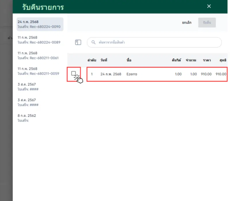 เมื่อเข้าสู่หน้ารับคืนรายการ ผู้ใช้งานสามารถดำเนินการรับคืนสินค้าได้โดย คลิกที่ช่องสี่เหลี่ยมหน้ารายการ ที่ต้องการรับคืน เพื่อเลือกทำรายการคืนสินค้าในระบบ