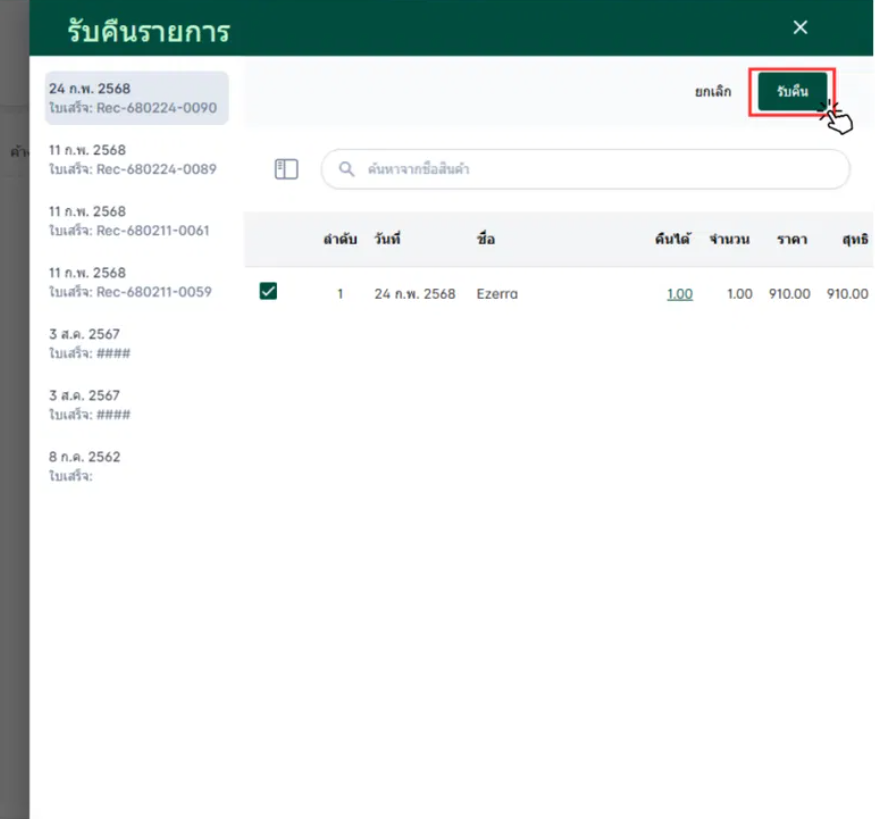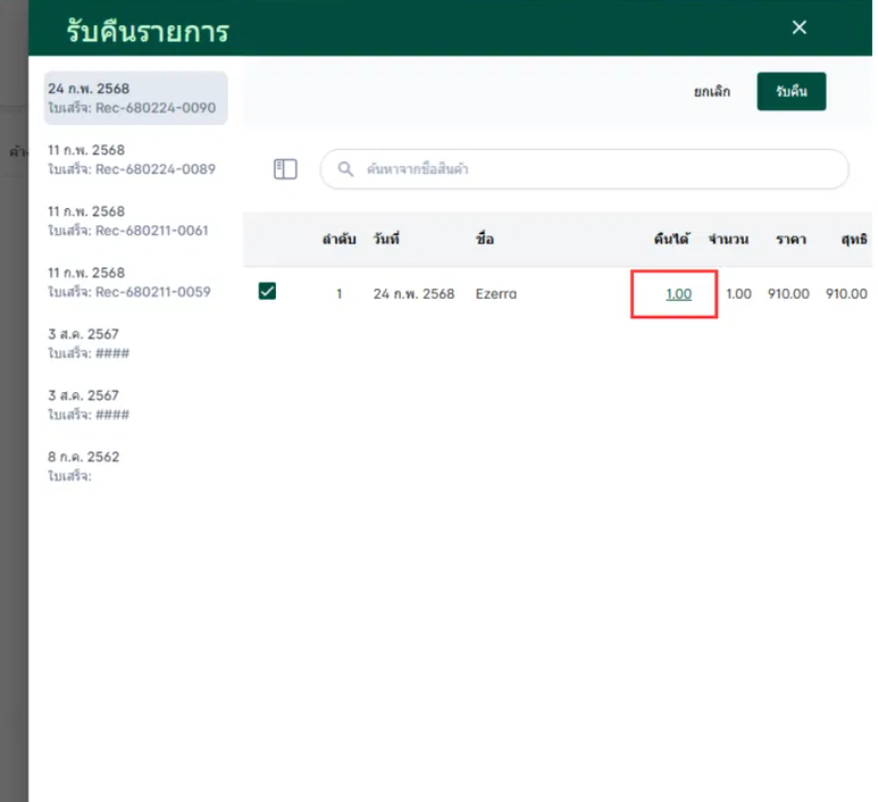 ผู้ใช้งานสามารถ เลือกรายการที่ต้องการรับคืนสินค้า จากรายการที่แสดง เพื่อดำเนินการรับคืน