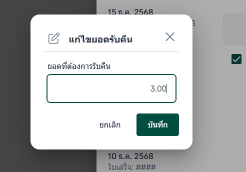 หลังจากผู้ใช้งานเลือกรายการ ระบบจะแสดง หน้าระบุยอดจำนวนที่ต้องการรับคืน