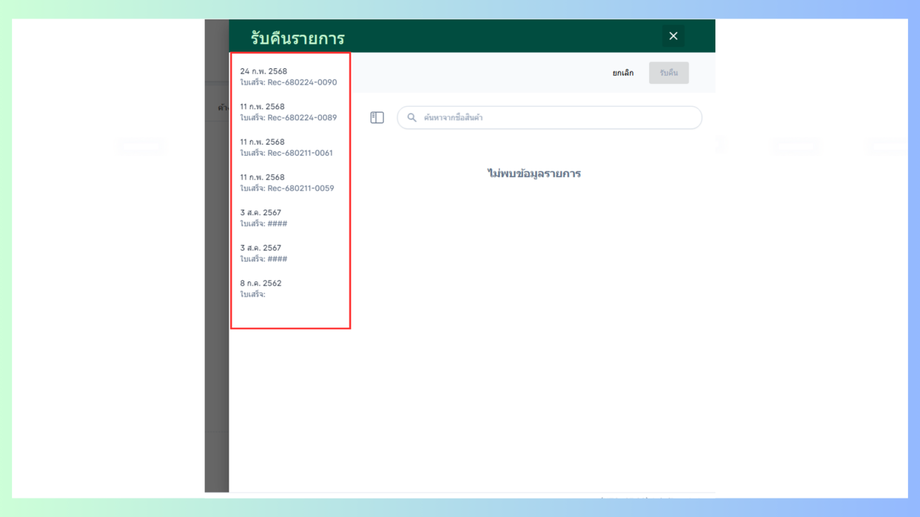 จะเข้าสู่หน้ารับคืนรายการ ทางซ้ายจะเป็นประวัติการสั่งคืนโดยจะระบุวัน/เดือน/ปี เลือกรายการที่ต้องการรับคืนสินค้า