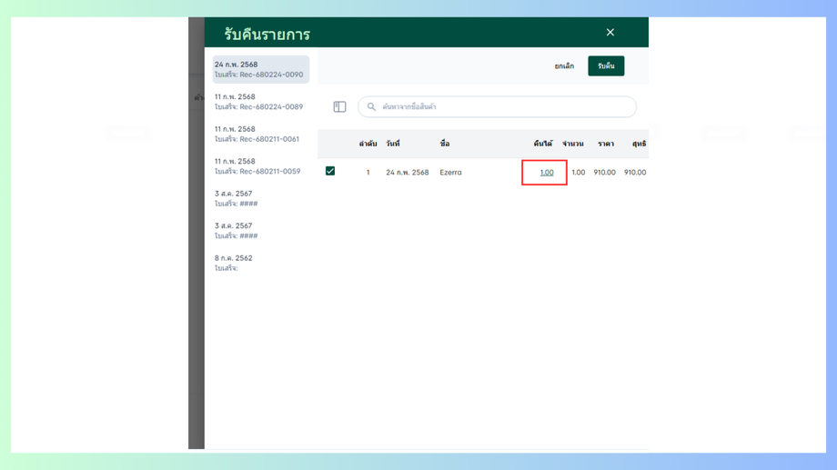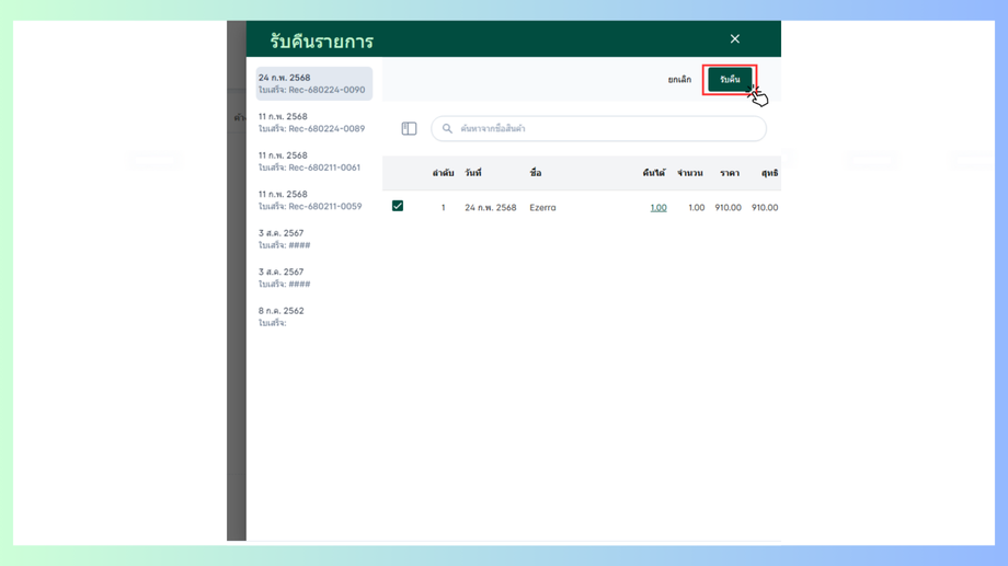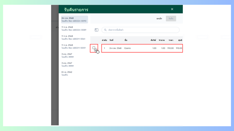 เข้าสู่การรับคืนรายการคลิกที่สี่เหลี่ยมจะสามารถรับคืนรายการได้