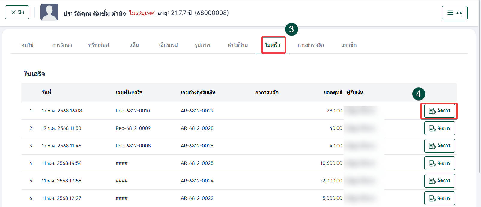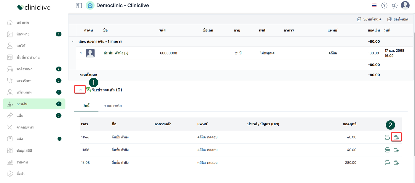 ผู้ใช้งานสามารถเข้าถึงหน้าประวัติผู้ป่วยได้จากเมนู รับเงิน จากนั้นดำเนินการตามลำดับดังนี้: