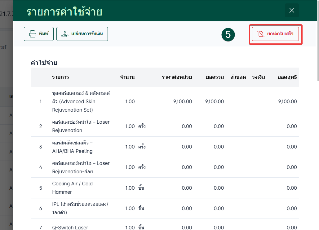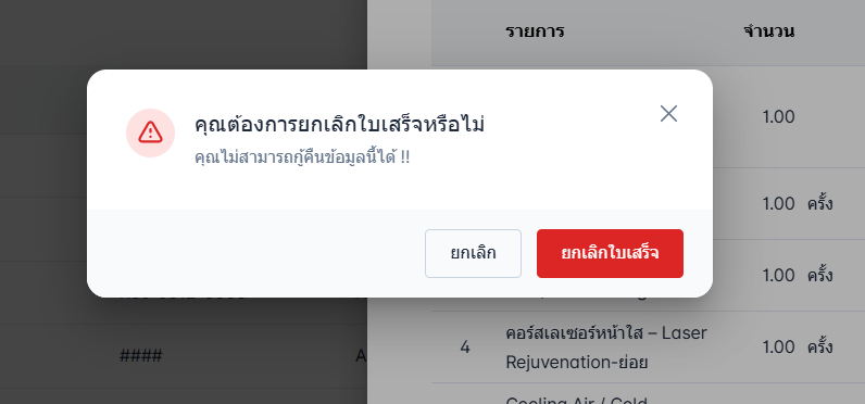 คลิกปุ่ม ยกเลิกใบเสร็จ เพื่อยืนยันการยกเลิกใบเสร็จ