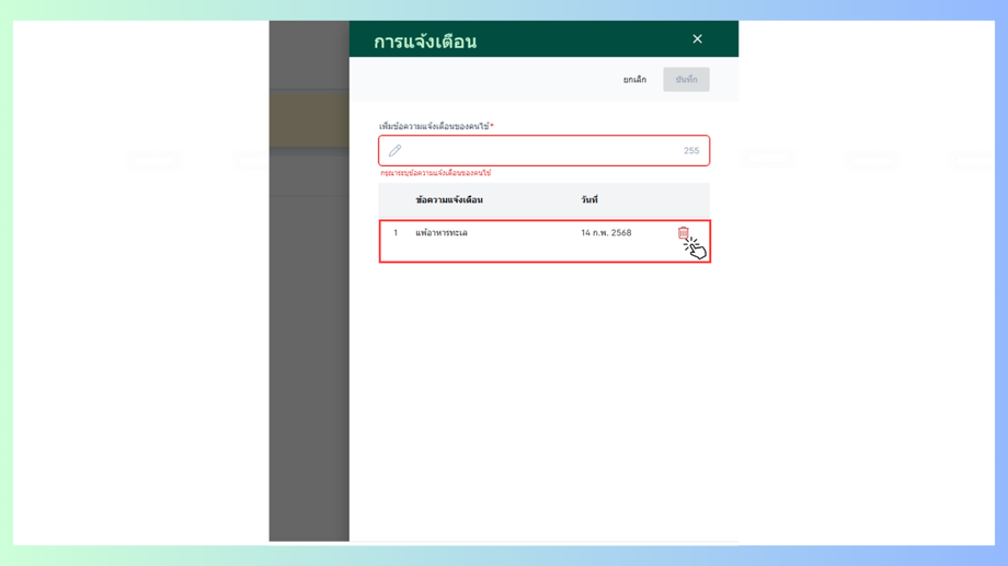 - เมื่อคลิกเลือกข้อความแจ้งเตือนแล้วจะมีหน้าหน้าขึ้นมาให้เพิ่มข้อความแจ้งเตือนของคนไข้ เมื่อเพิ่มข้อมูลแล้วกดบันทึก