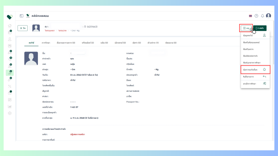 เข้าไปที่ข้อมูลคนไข้ > จากนั้นกดปุ่มเมนู > คลิกเลือกข้อความแจ้งเตือน