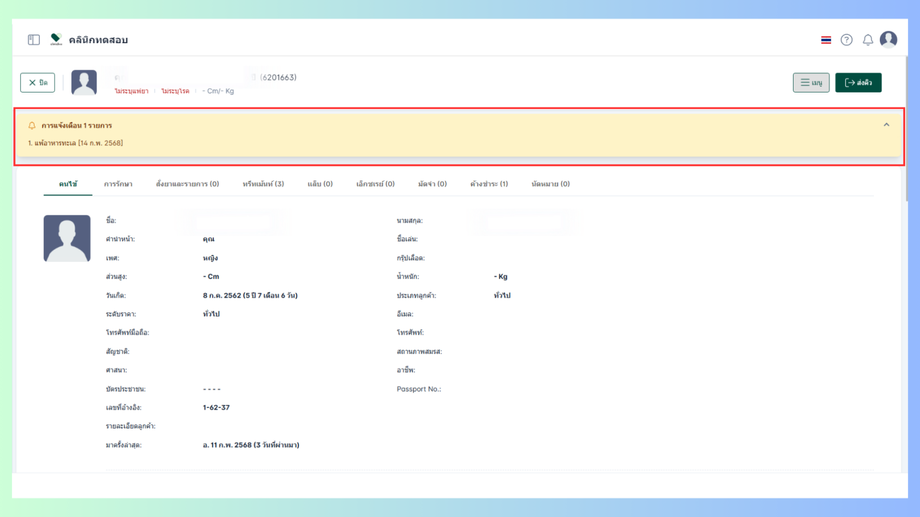 - เมื่อผู้ใช้งานทำการเพิ่มข้อความแจ้งเตือนของคนไข้แล้ว ระบบจะแสดงข้อความแจ้งเตือนทุกครั้งเมื่อมีการเข้ามาที่คนไข้ที่เพิ่มข้อความแจ้งเตือนไว้