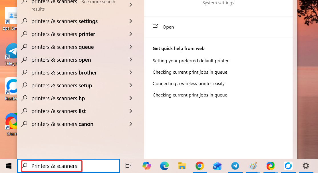พิมพ์คำว่า Printers & scanners ลงในช่องค้นหาของ Windows แล้วกด Enter