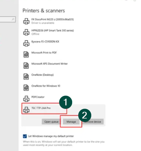 จากนั้นเลือกเครื่องพิมพ์ที่ต้องการใช้งาน แล้วคลิก Manage