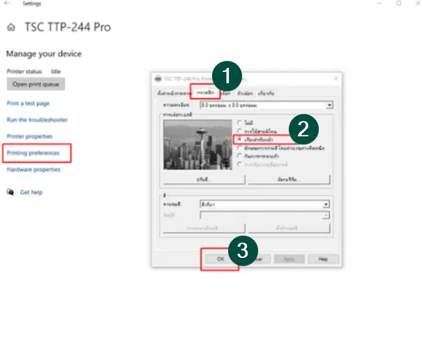 เมื่อมีหน้าต่างการตั้งค่าเครื่องพิมพ์แสดงขึ้นมา ให้ปรับค่าตามขั้นตอนที่กำหนดไว้ (ตามรูปประกอบหรือการตั้งค่าที่แนะนำ)
