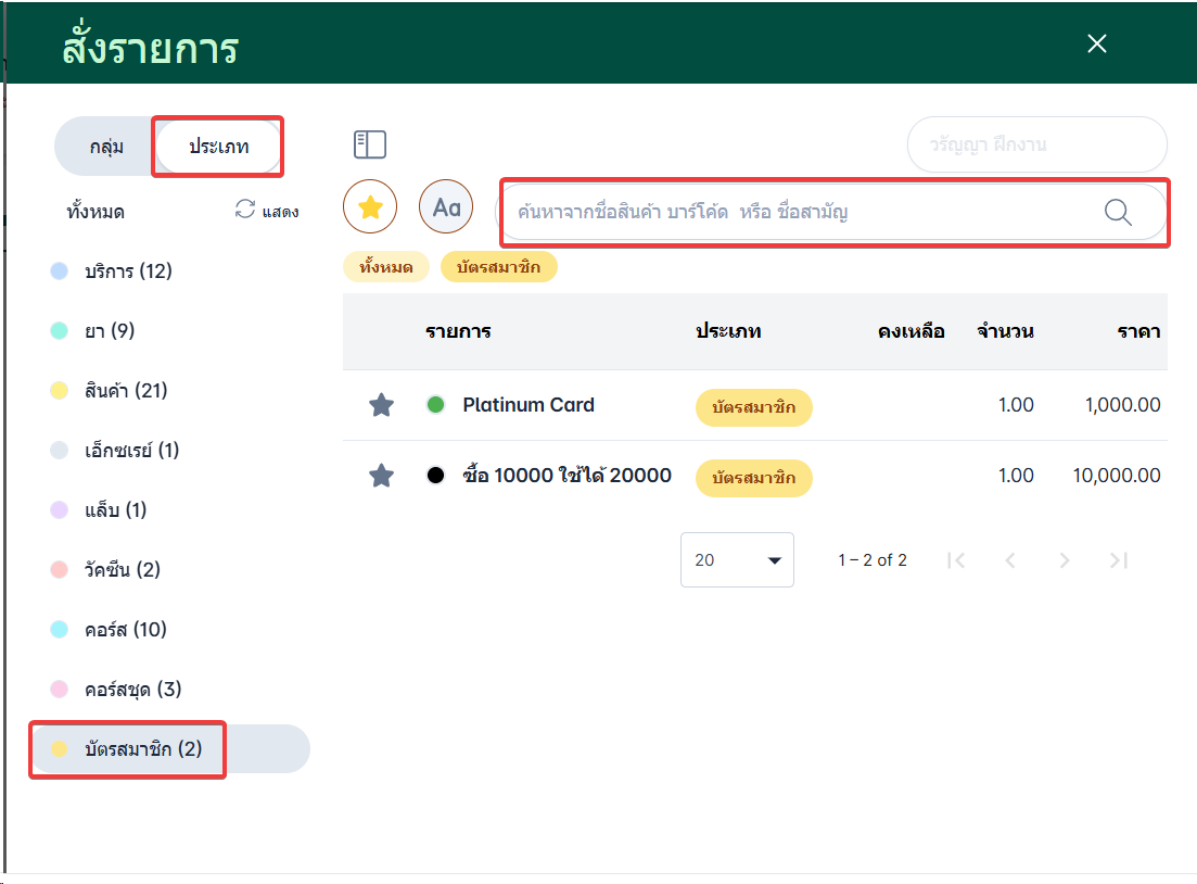 หลังจากทำการ คลิก + สั่งรายการ ระบบจะแสดงหน้าต่างรายการสินค้า สามารถทำได้ดังนี้