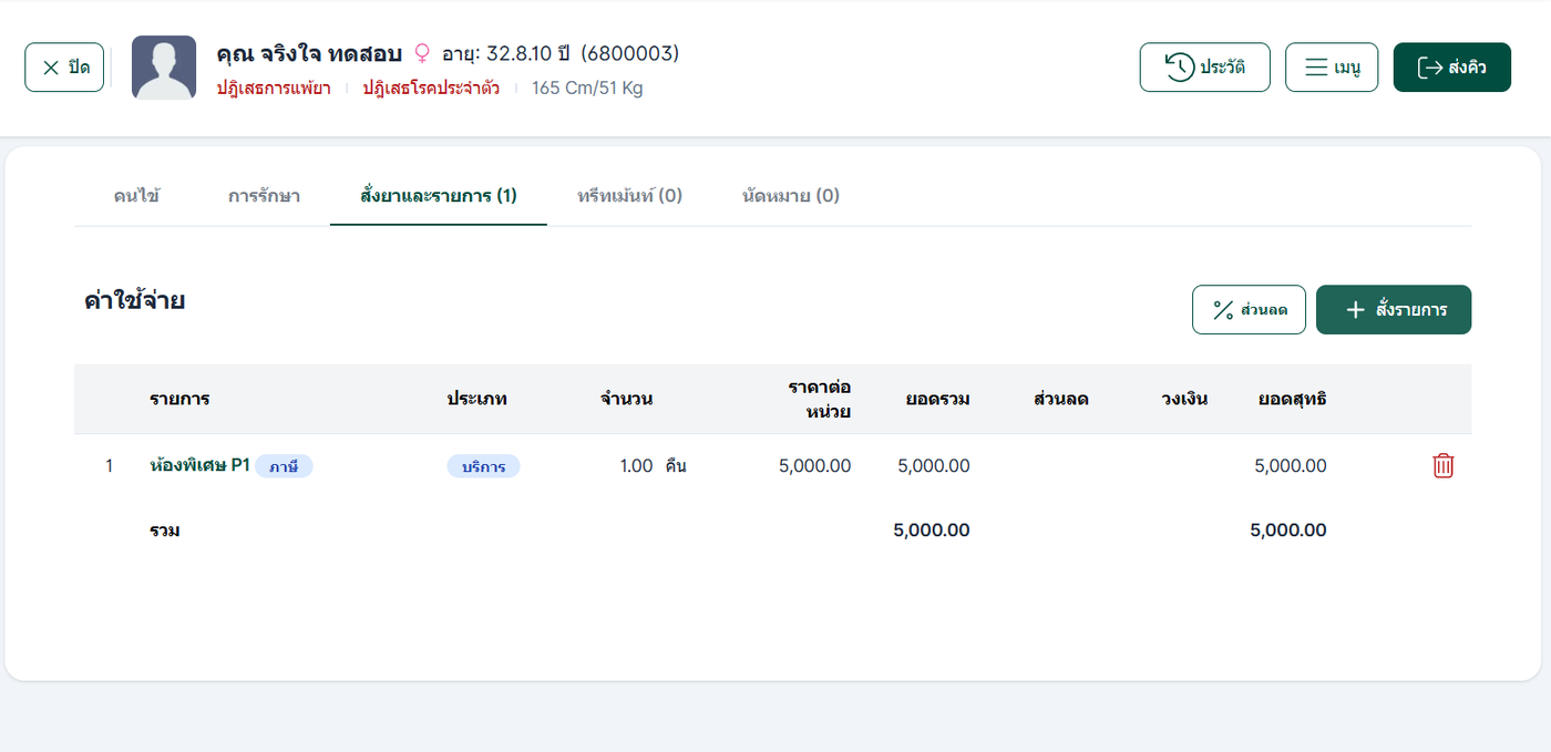 ในหน้าต่างค่าใช้จ่าย ระบบจะแสดงรายละเอียดของรายการบริการที่สั่งไว้
