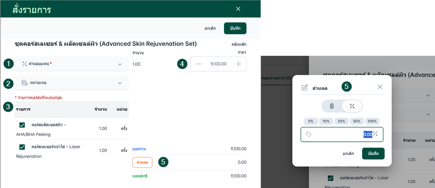 หลังจากคลิกที่ + สั่งรายการ ระบบจะแสดงหน้าต่างสั่งรายการ ขั้นตอนการสั่งรายการมีดังนี้