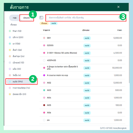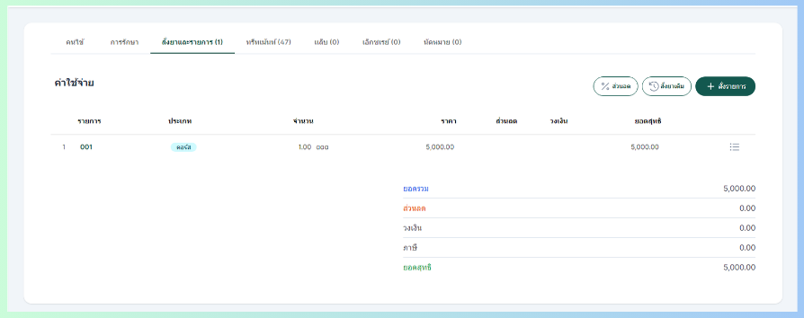 การสั่งคอร์ส 1. เข้าที่แท็บตรวจรักษา> สั่งยาและรายการ > สั่งรายการ2.เลือกประเภท > คอร์ส > ค้นหาชื่อคอร์สที่เราต้องการ3.เลือก % ค่าตอบแทน > กดบันทึก4. รายการที่สั่งจะขึ้นแสดงดังนี้