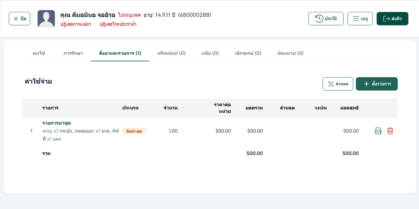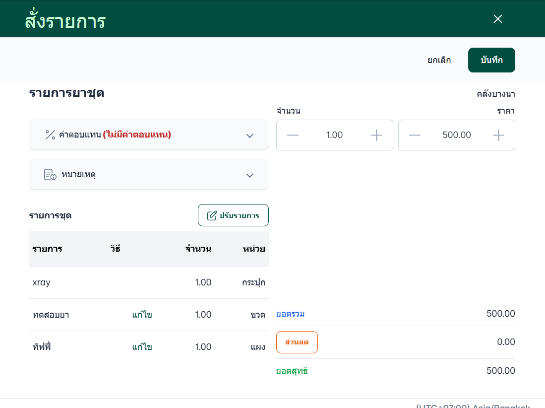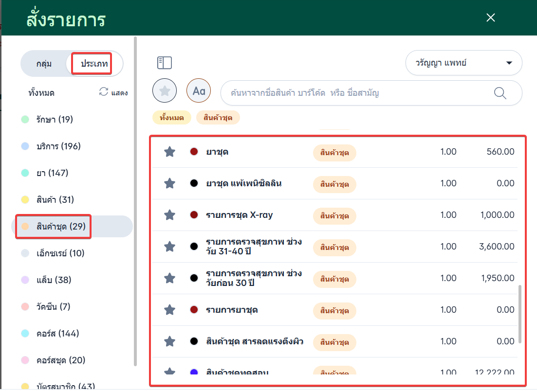 บันทึกรายการสินค้าชุดลงในแท็บ สั่งยาและรายการ