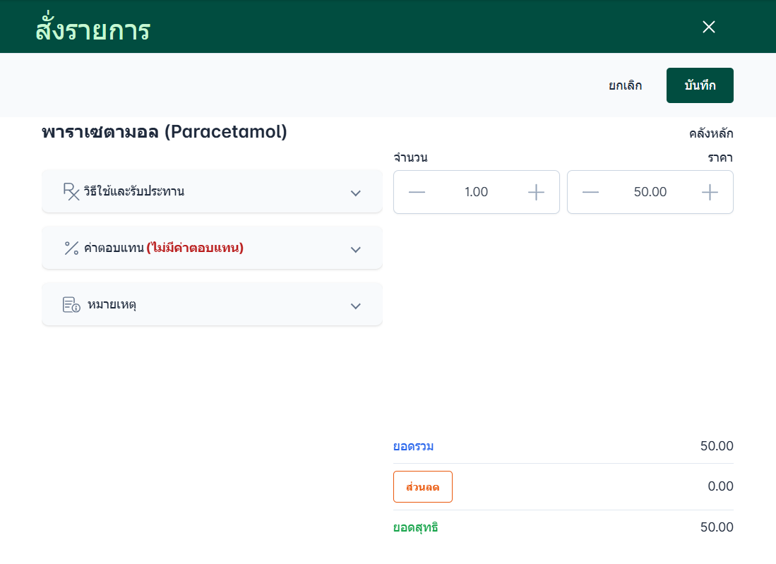 หากผู้ใช้งานมีสิทธิ์ในการแก้ไขราคา จะสามารถปรับราคาของรายการยาได้โดยตรงส่วนลด