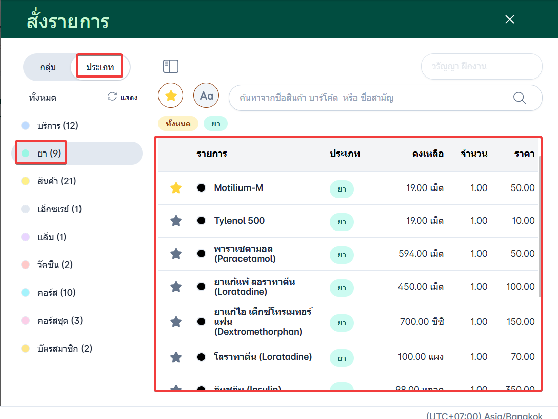 เลือกประเภท ยา แล้วเลือกรายการยาที่ต้องการสั่ง