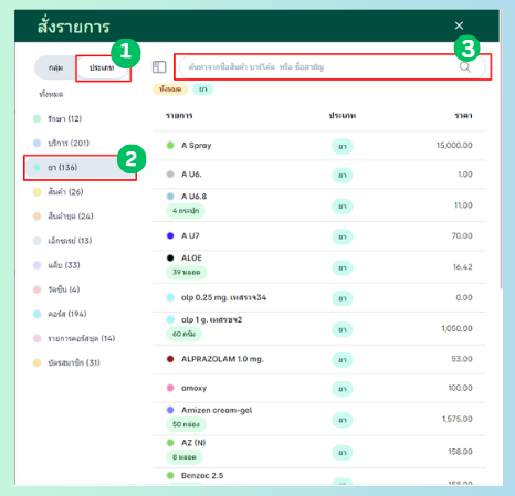 2.เลือกประเภท > ยา > ค้นหาชื่อยาหรือเลือกจากรายชื่อด้านล่างได้เลย