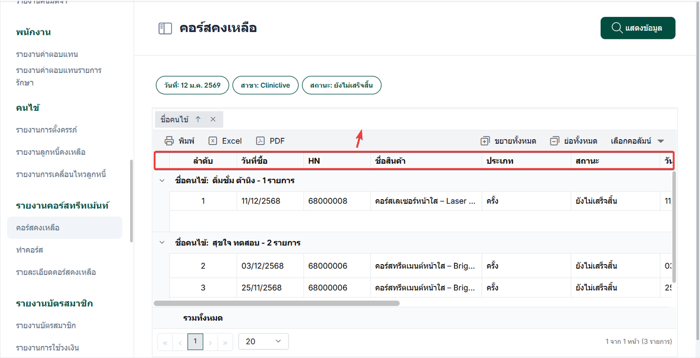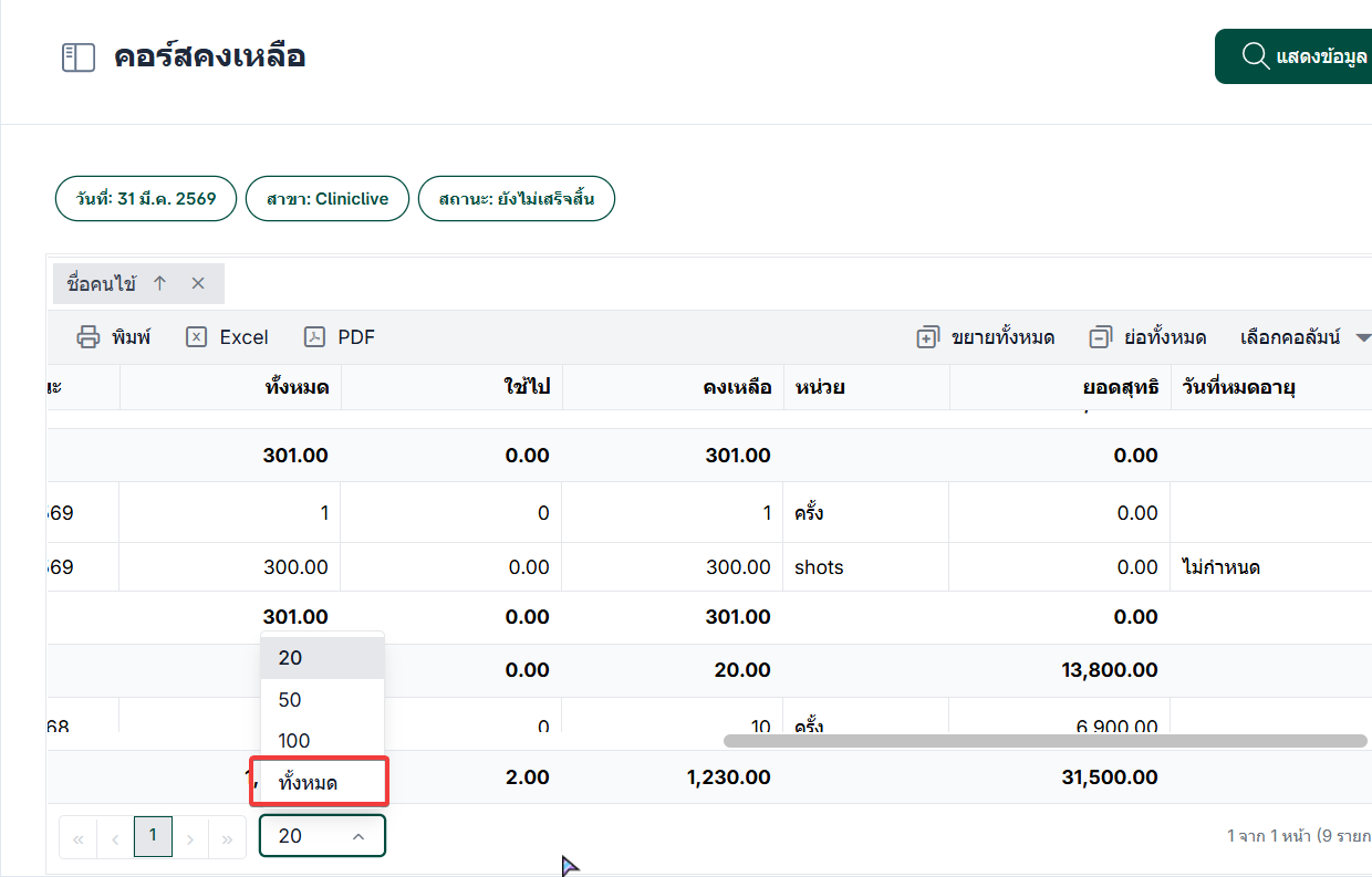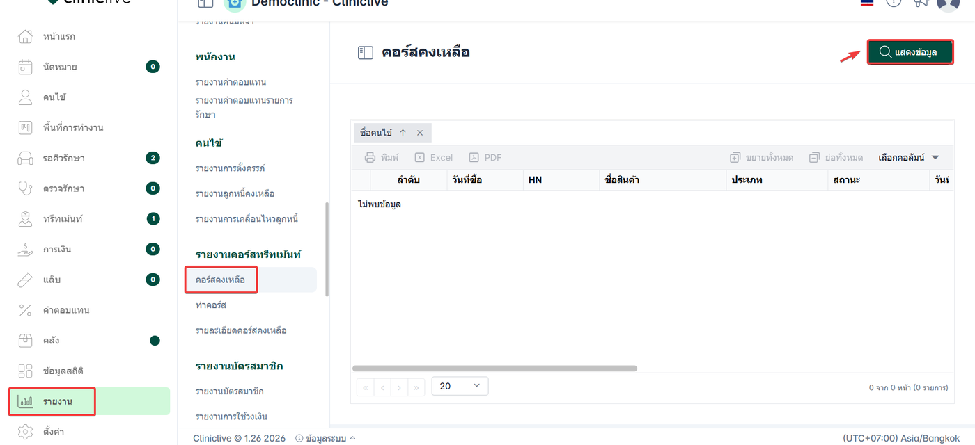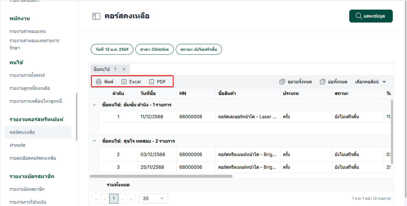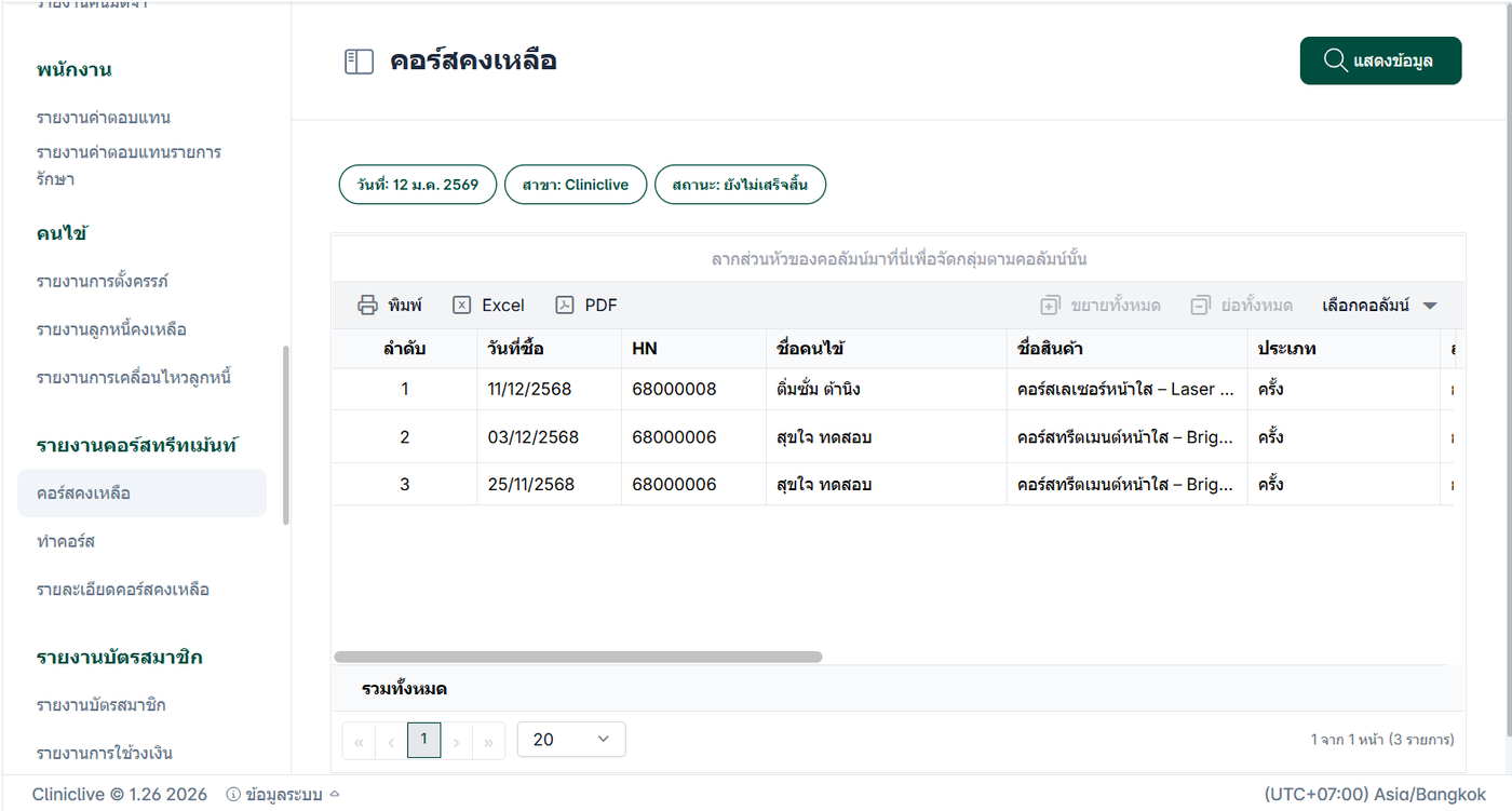 รายงานข้อมูลคอร์สคงเหลือ คือเอกสารหรือรายงานที่ใช้แสดง ข้อมูลคอร์สที่ยังคงเหลืออยู่ในระบบ ณ วันที่ทำรายงาน รายงานนี้ช่วยให้ผู้ใช้งานสามารถตรวจสอบจำนวนครั้งหรือมูลค่าคอร์สที่ยังคงเหลือ,ติดตามการใช้คอร์สของผู้รับบริการ