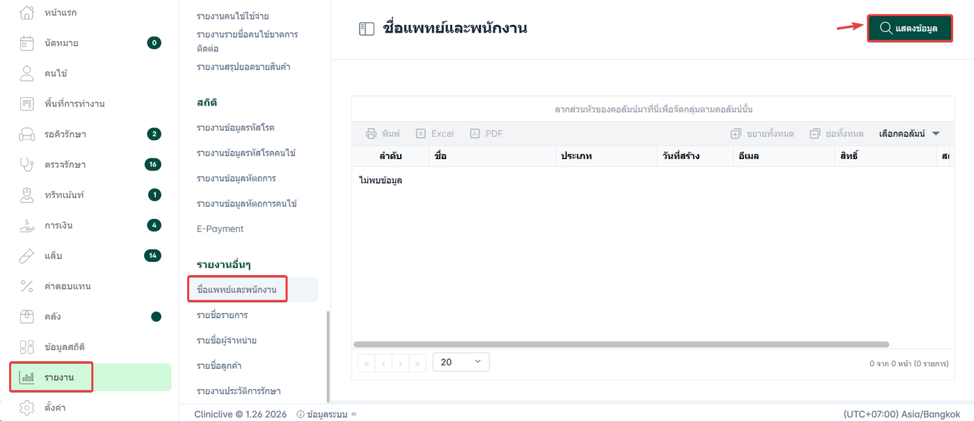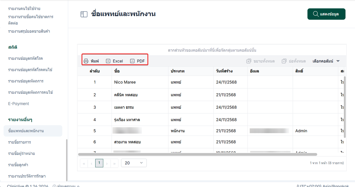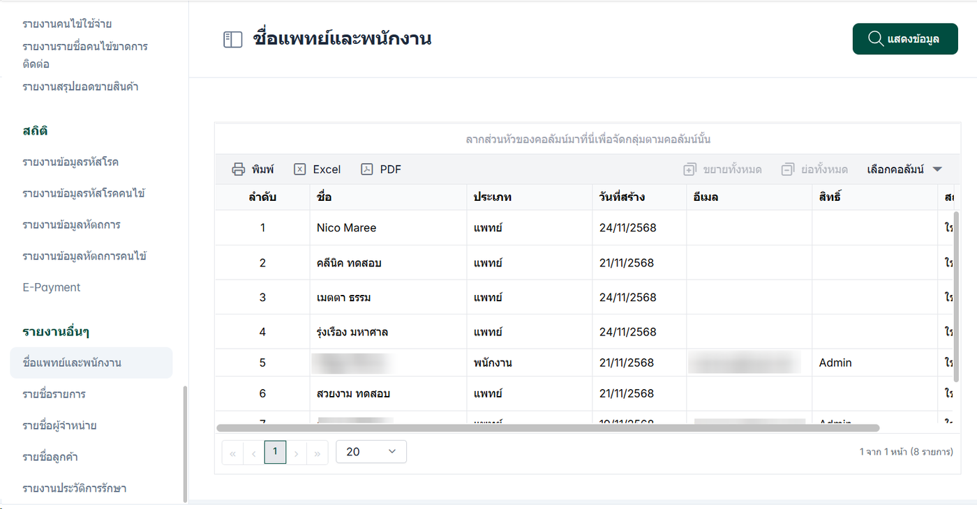 รายงานนี้ทำให้ผู้ดูแลระบบหรือเจ้าหน้าที่สามารถกรองข้อมูลรายชื่อแพทย์และพนักงานของคลินิกตามความต้องการเพื่อให้ได้ข้อมูลที่ต้องการ